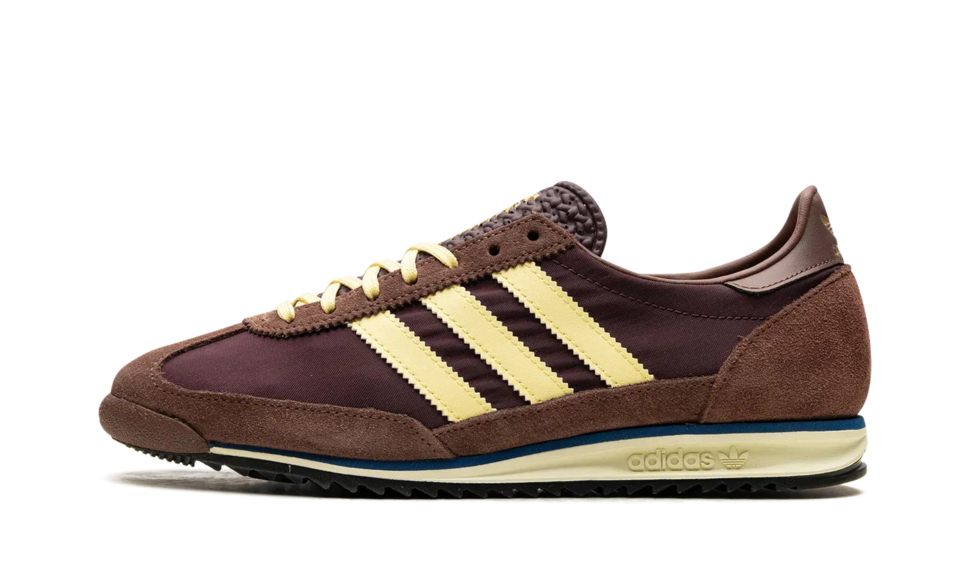 The adidas SL 72 OG Maroon Preloved Brown presents a classic, streamlined aesthetic. Dark brown textile meets light brown suede overlays, creating rich texture. Beige 3-Stripes offer subtle contrast, complemented by gold adidas logos on the heel and tongue. A slim rubber outsole, embossed with the brand's logo, honors its heritage. This sneaker balances retro style with everyday practicality. Its slim silhouette and refined details make it a versatile choice, combining timeless design with comfortable wearability.