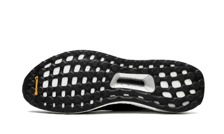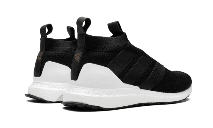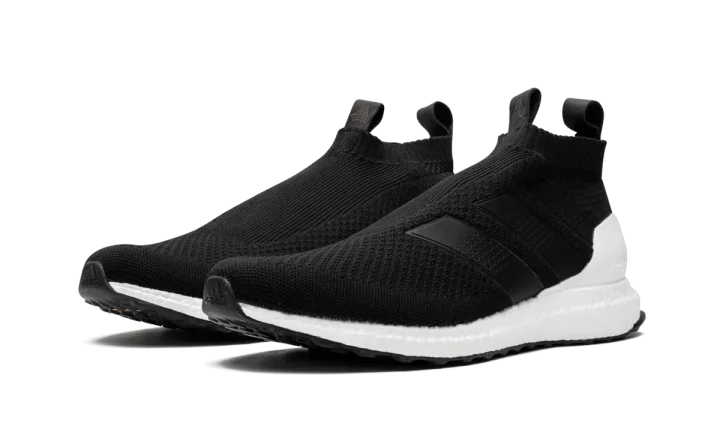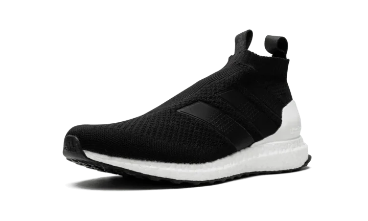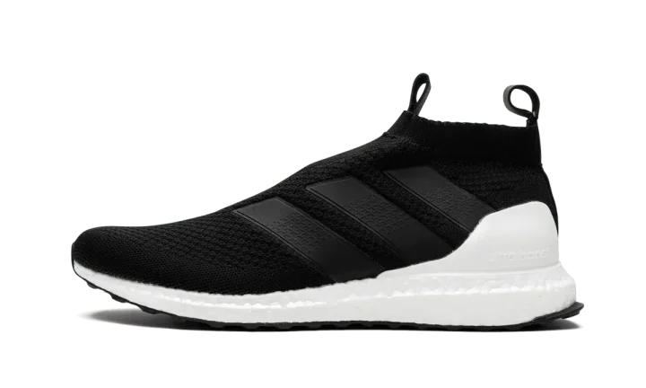 Black Ace 16+ Ultraboost sneakers from adidas featuring a signature three stripe detail to the side, an almond toe, a lace fastening, a ridged rubber sole and a slip-on style.