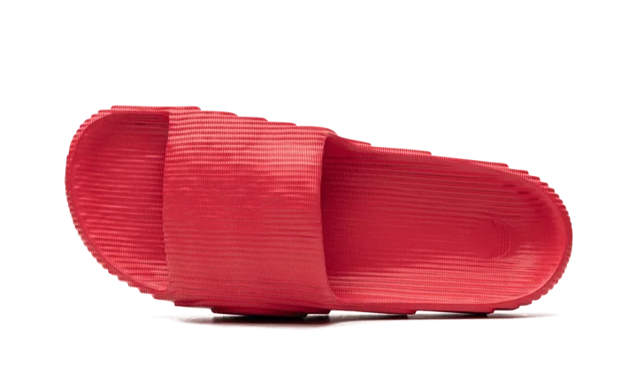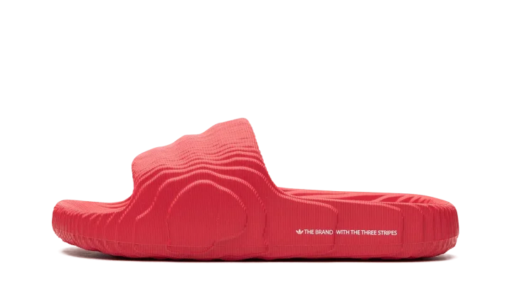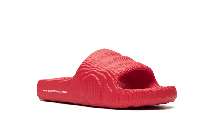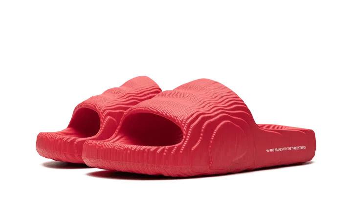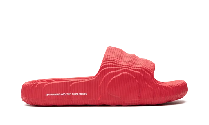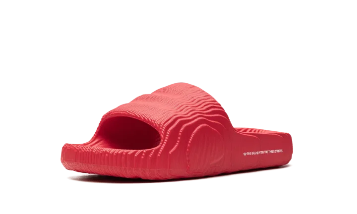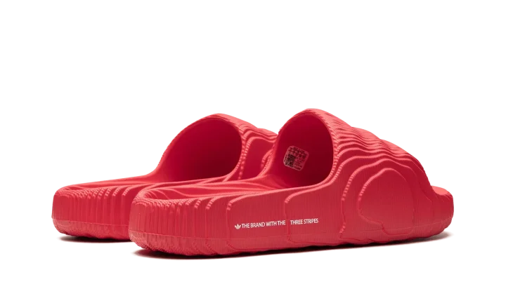 The adidas Adilette 22 Slide "Scarlet" is a colorway of the comfortable slip-on sandal that's made from eco-friendly materials. Designed similarly to the popular adidas Yeezy Slide, the Adilette 22 has a contemporary vibe with wavy lines inspired by 3D topography. The sandal is made from lightweight EVA foam that contains up to 25% plant-based ingredients derived from sugarcane. The "Scarlet" colorway features a monochromatic Scarlet red appearance with "The Brand With the Three Stripes" branding on the lateral side of the footbed.