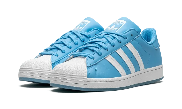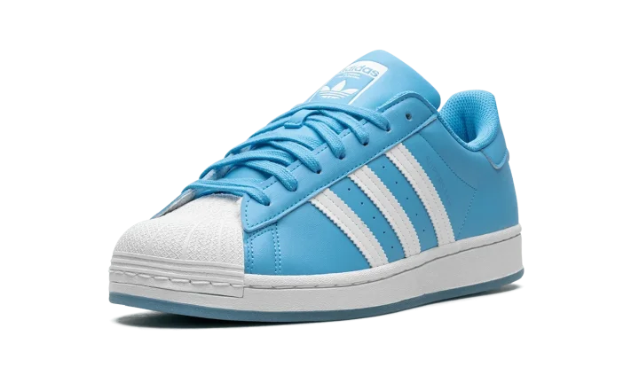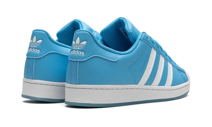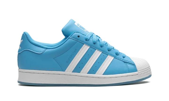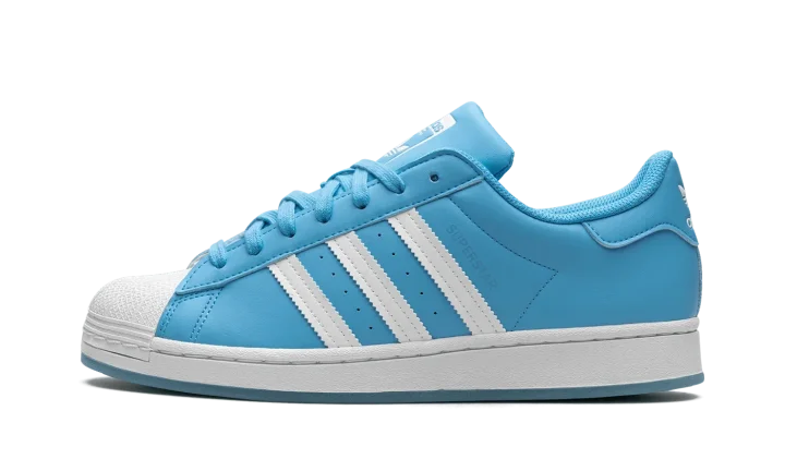 The Adidas Superstar 'Sky Rush' shoe features a classic design in a vibrant sky blue colorway, making it a versatile and stylish addition to any sneaker collection.