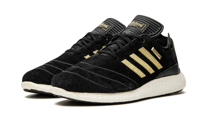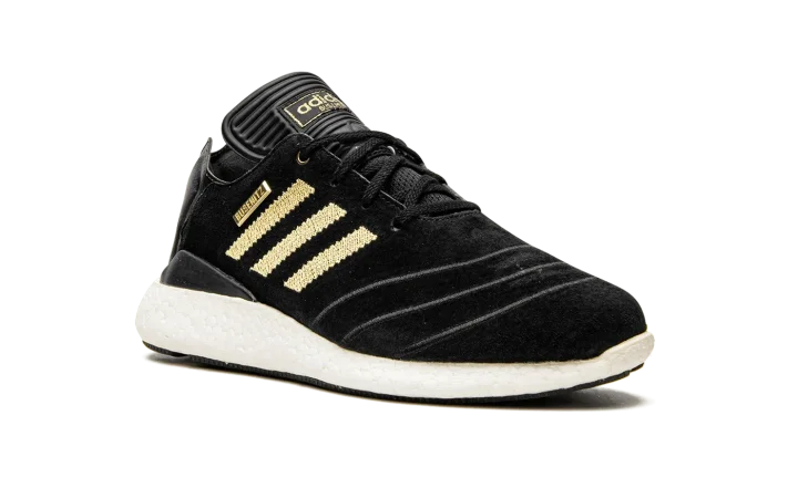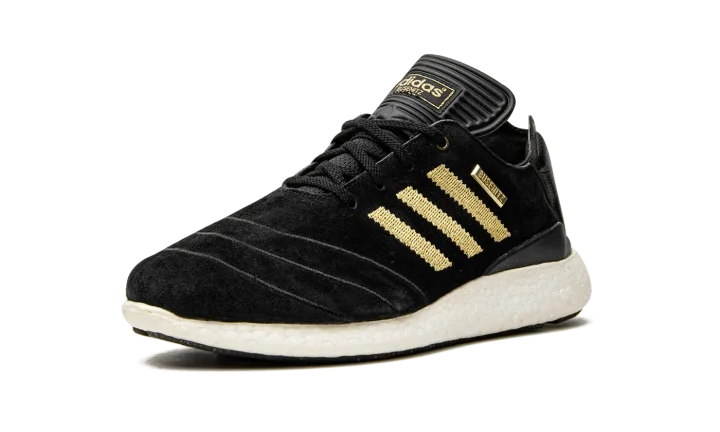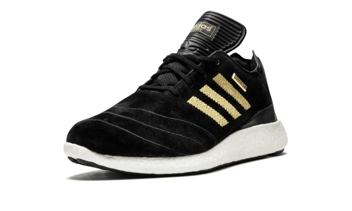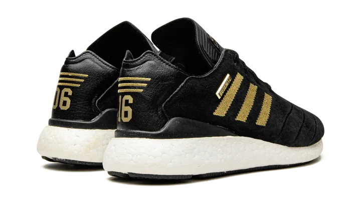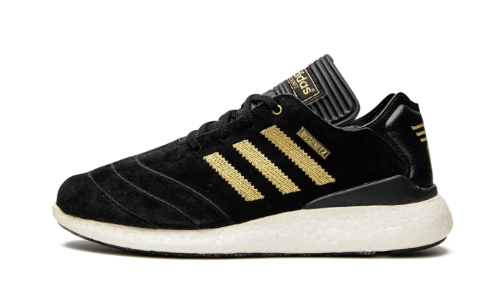 The adidas Busenitz Pure Boost "10th Anniversary," released in 2016, marks a partnership that launched a decade of skateboarding shoes from pro skater Dennis Busenitz. This celebratory iteration features a smooth black leather upper. Luxe detailing appears on the shoe's signature gold stripes, along with the "06" and "16" numbers on each heel that signify the partnership's start year and its 10-year anniversary. All of this sits atop a comfortable Boost midsole and black rubber sole.