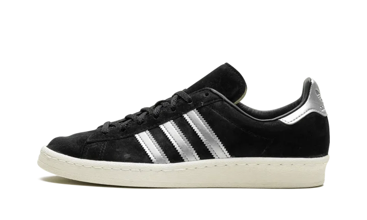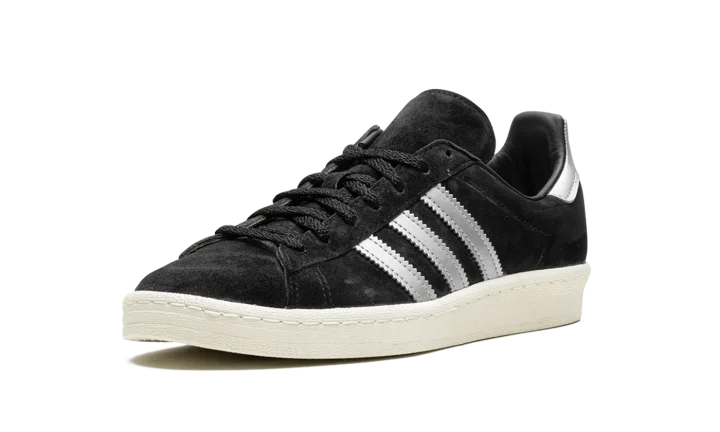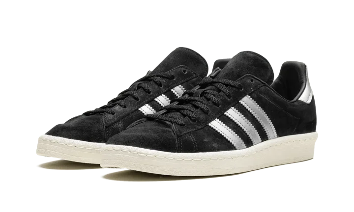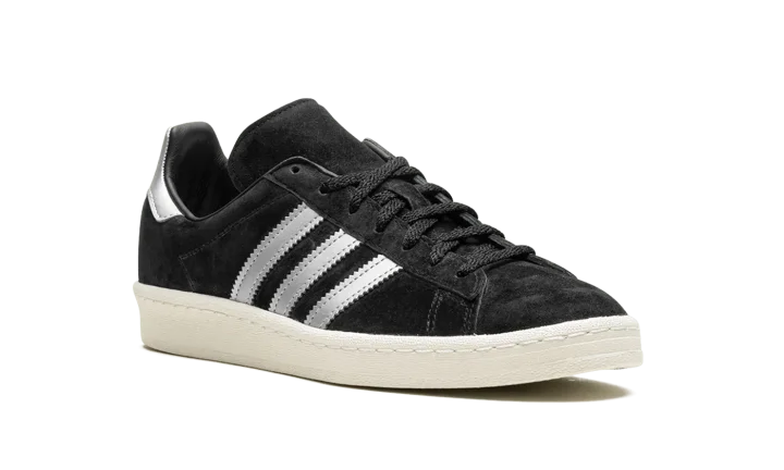 The adidas Campus 80s "Black/Off White" is a two-tone, black-and-white colorway of the retro shoe by the German footwear brand. The adidas Campus 80s in "Black/Off White" is designed in a versatile look for everyday wear. Specifically, the upper has a black suede construction and is contrasted with flashy Metallic Silver leather Three Stripes on the sides. More eye-catching Metallic Silver accenting appears on the heel. A black suede tongue and Off White rubber sole complete the look.