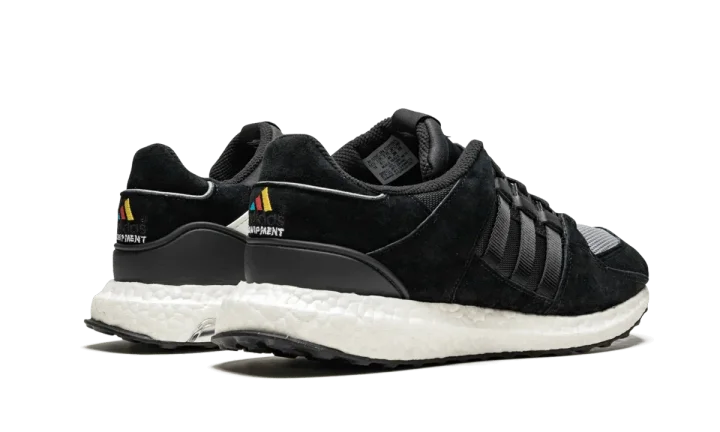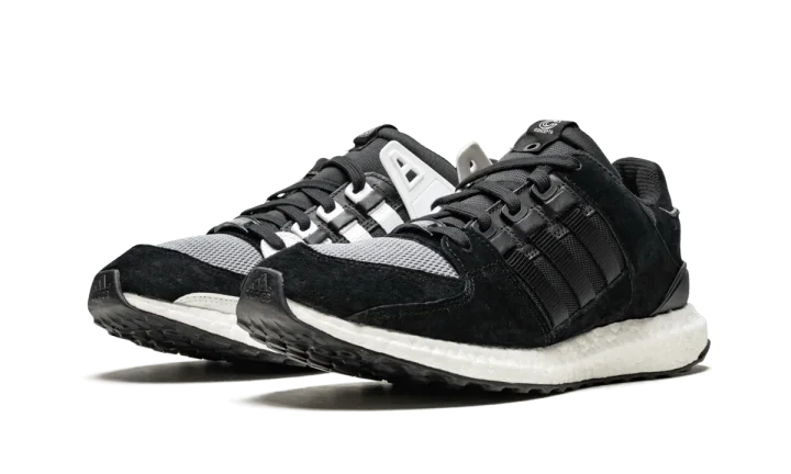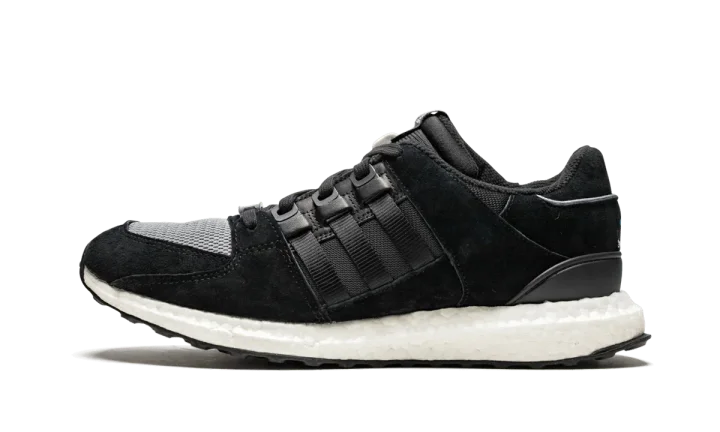 These low top running kicks from Adidas feature an all-black upper on one shoe and a white and black striped pattern on the other. A white pebble-like midsole is shared across both shoes with the Adidas Equipment logo on the back heels.