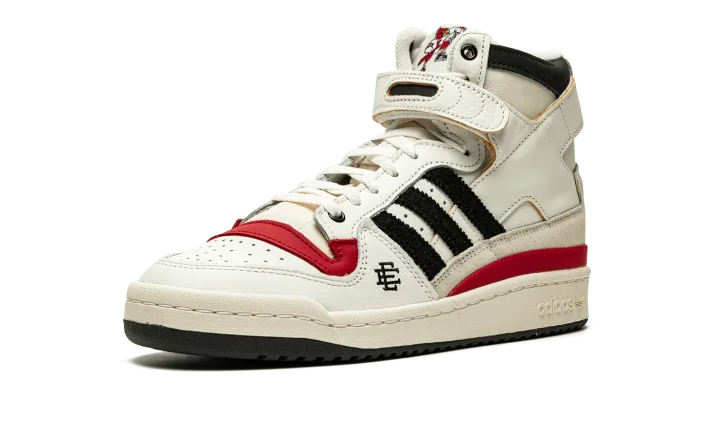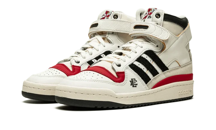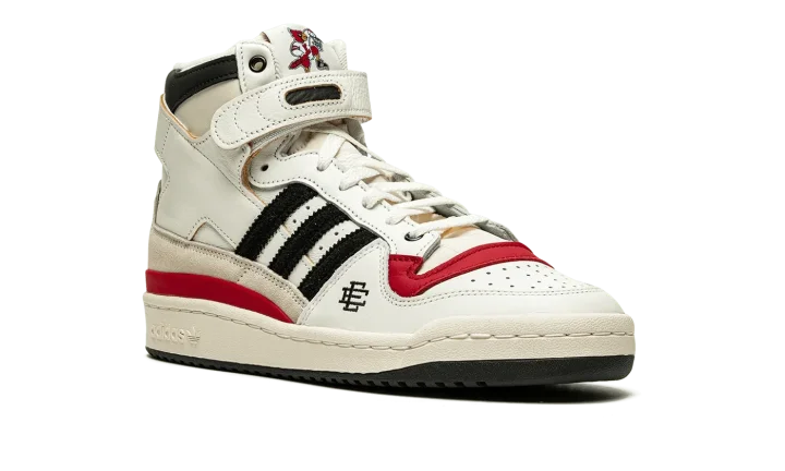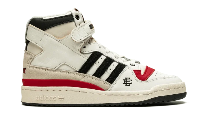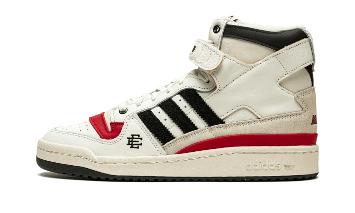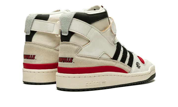 The Eric Emanuel x adidas Forum 84 Hi "Louisville" is a December 2021 collaboration by the fashion designer on the vintage basketball shoe in a colorway dedicated to the Louisville Cardinals. Emanuel's collaboration on the Forum 84 Hi in the "Louisville" colorway is one of multiple college basketball makeups of the shoe released in 2021, which includes styles made up in the honor of the Kansas Jayhawks and Indiana Hoosiers. Here, though, the "Louisville" features mostly light cream-colored leather appearance with tonal overlays. A black felt Three Stripes branding hit appears on the sides. "Louisville" branding in red is found on the sand-colored suede heel overlay on the back of the shoe. Additional iconography exclusive to the Louisville Cardinals college basketball team appears in the form of the school's mascot, Cardinal Bird, on the tongue tag. Navy "EE" detailing can be found on the lateral side of the forefoot. A black tumbled leather overlay appears on the collar above the adjustable white leather ankle strap. Finishing touches include a cream rubber midsole and contrasting black outsole.