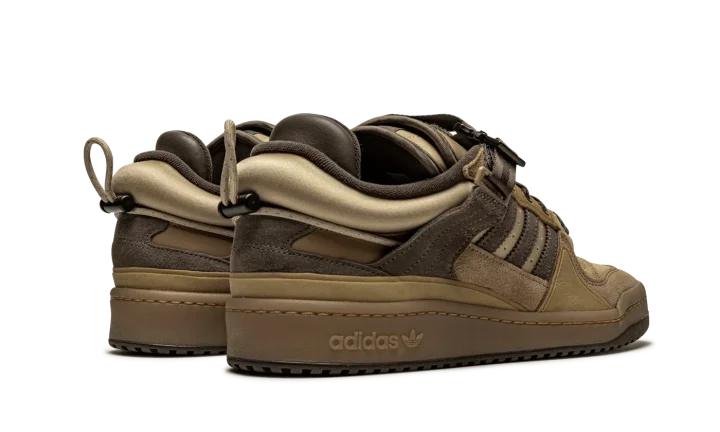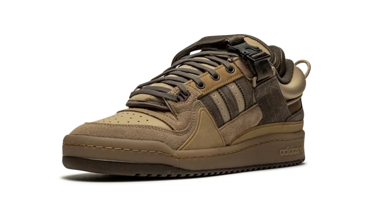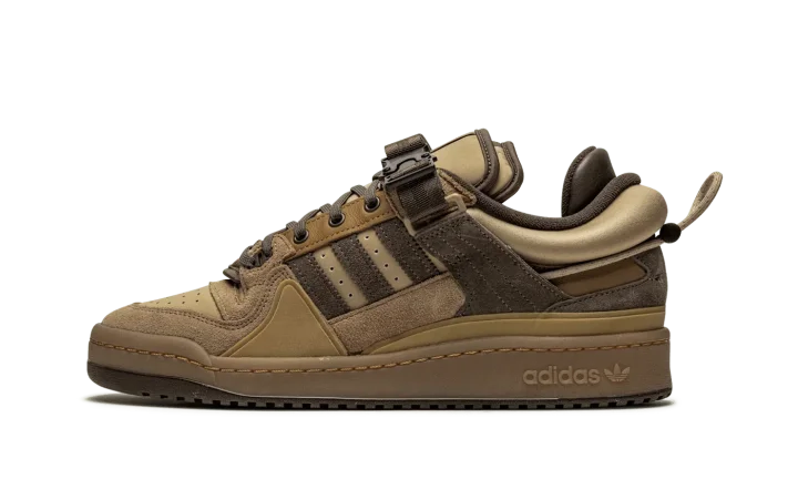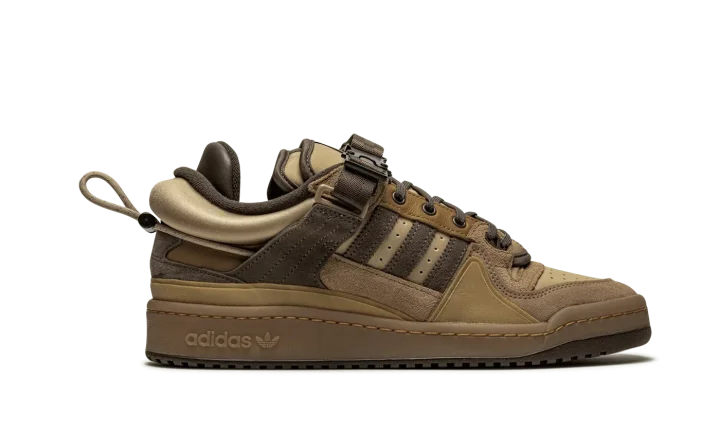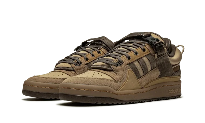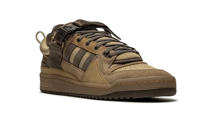 The Bad Bunny x adidas Forum Low Buckle "The First Cafe" is the first-ever collaboration between the Grammy Award winning recording artist and adidas on the retro performance basketball shoe. A March 2021 release, the "The First Cafe" is nicknamed and stylistically inspired by Bad Bunny's appreciation for a morning cup of coffee. A combination of suede and leather panels in various mocha hues adorn the forefoot, toe, collar, and heel. The model's signature Three Stripes detailing is finished off in dark brown suede matched by overlays on the lateral side of the heel. A plush java leather construction forms the base of the shoe. Two unique, overlapping and interchangeable tongues allow the wearer to customize the look. A brown nylon ankle strap with "YO VISTO ASI," which translates to "I dress like this" from Spanish, is embroidered under the strap. A lace toggle and double heel design on the back of the shoe enhance the upscale vibe of Bad Bunny's debut adidas collaboration.