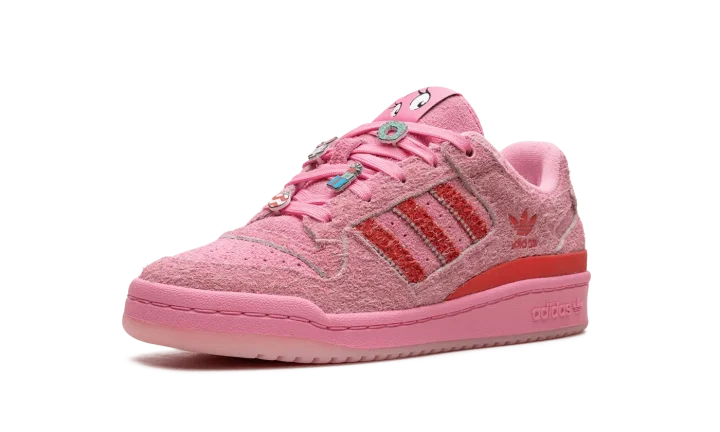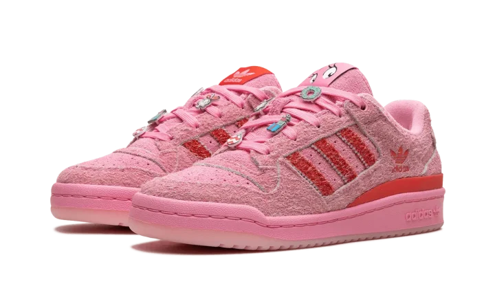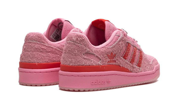 The adidas Forum Low "The Grinch - Cindy Lou Who" is a colorway of the classic basketball shoe inspired by the Dr. Seuss character of the same name from the children's book and animated Christmas special, "The Grinch". One of three colorways from a collaboration between Dr. Seuss and adidas, the "Cindy Lou Who" is inspired by the young girl who catches The Grinch stealing her family's Christmas tree when getting a glass of water during the night. The upper features a hairy pink suede appearance with bright red suede Three Stripes branding. Detailing inspired by Cindy Lou Who can be found on the tongue and insole. Lace dubraes also inspired by Cindy Lou Who appear on the laces.