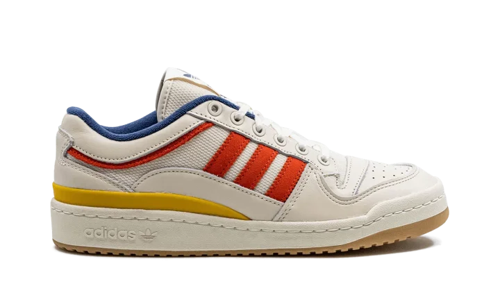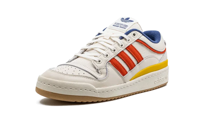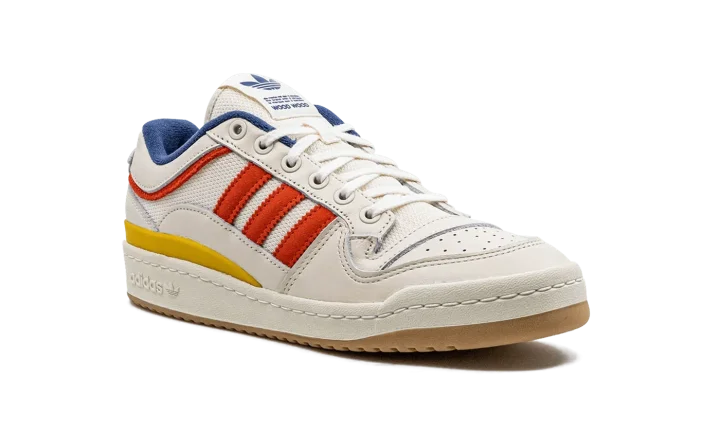The Wood Wood x adidas Forum Low "White/Red" is a collaboration by the Copenhagen based clothing brand and adidas on the vintage basketball shoe. Wood Wood's vision for the adidas Forum Low updates the classic sneaker's design by removing its signature velcro strap for a more streamlined appearance. The shoe features a white leather base with a tonal mesh construction on the sides. Adidas's signature Three Stripes branding is found in red on either side of the shoe. Elsewhere, yellow trim accents the heel and the interior of the shoe is finished in blue terry cloth. Dual "Wood Wood" and adidas logos are found on the tongue.