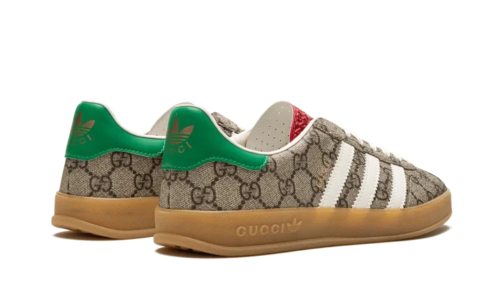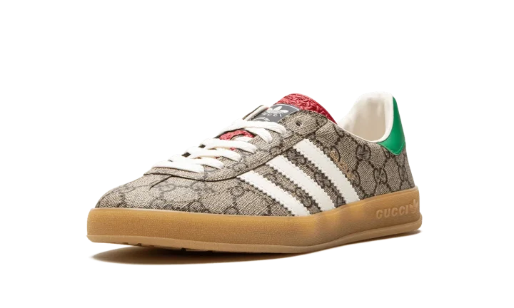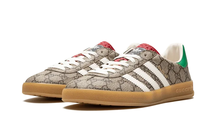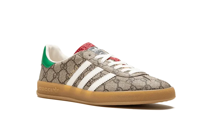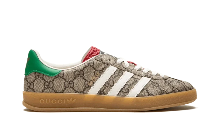 The Gucci x adidas Gazelle "Beige" is a limited edition collaboration by the legendary high fashion house on the popular lifestyle sneaker that features the brand's iconic monogram pattern. Gucci and adidas's second collaboration brings a luxurious twist to the adidas Gazelle by placing the former's "GG" monogram print in an all-over style on the shoe's canvas upper. The look is inspired by 1980s-era sportswear aesthetics. Black leather Three Stripes branding can be found on either side of the shoe while gold co-branding appears on the black leather heel tab. Additional co-branding is found on the tongue. "GG" embossed branding appears on the gum rubber midsole.