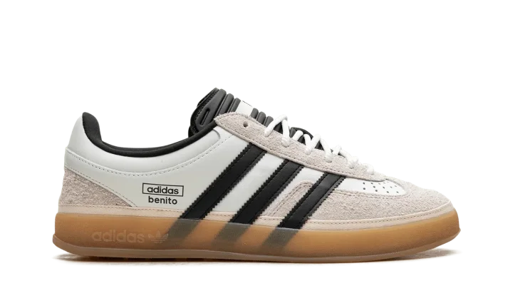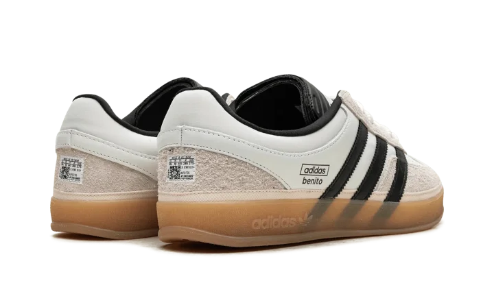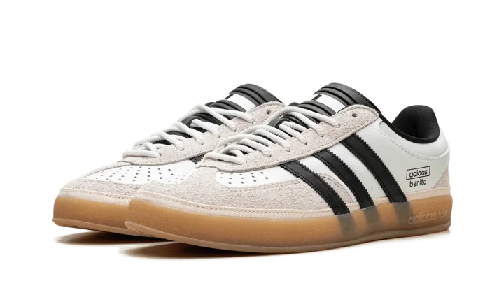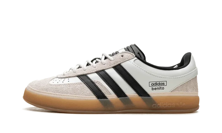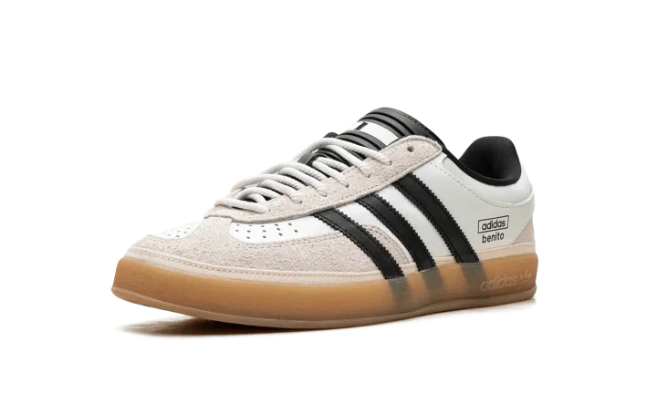 The Bad Bunny x adidas Gazelle Indoor "Off White" is a collaboration on the retro indoor soccer style by the ultra-popular international recording artist. Bad Bunny and adidas's partnership began with a bang with the debut of the adidas Forum Buckle Low in 2021. Since then, the pair has released several high-profile sneakers, including this Gazelle Indoor in versatile "Off White". The upper has an Off White leather design with grey hairy suede overlays on the toe and heel. Oversized black leather Three Stripes branding appears on either side of the shoe, while "adidas" "Benito" stamps can be seen on the lateral side of the mid-panel. White rope-style laces are layered over the black tongue. A semi-translucent Gum rubber sole completes the look.