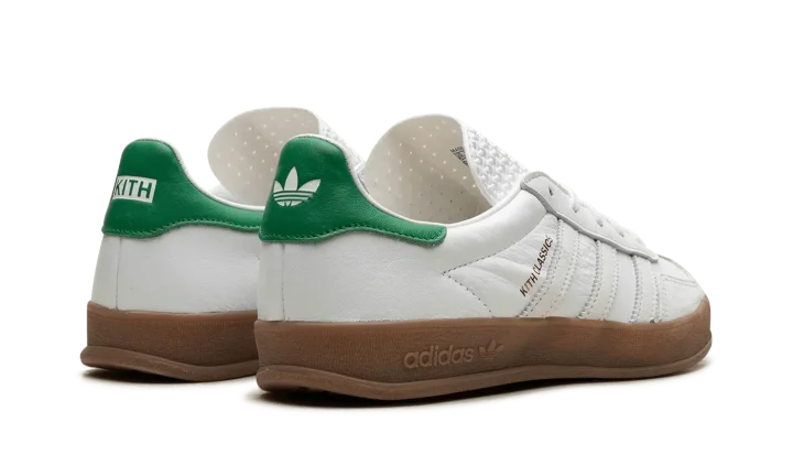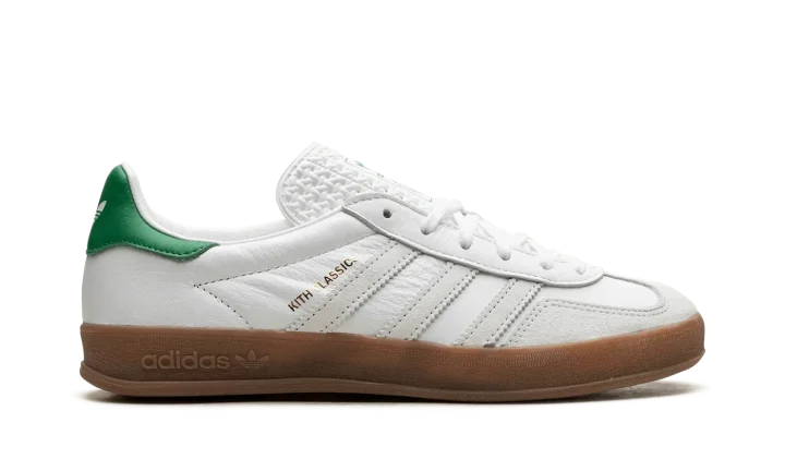 The Kith x adidas Gazelle Indoor "White/Green" is a collaboration by Ronnie Fieg's sneaker boutique and adidas on the classic shoe. The Kith x adidas Gazelle Indoor "White/Green" is one of multiple sneakers by Kith and adidas from Kith's "Classics Program". The upper has a white leather base and light grey suede overlays on the toe and Three Stripes. A Gold "Kith Classics" logo appears on the lateral side of the mid-panel, while dual branding can be found on the tongue and heel. A gum rubber sole rounds out the look.