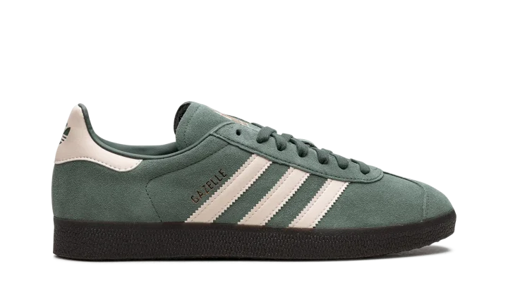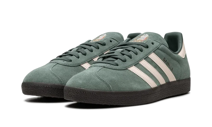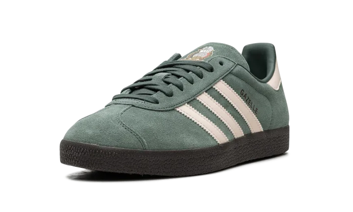 The adidas Gazelle "Mexico" is a colorway of the retro soccer sneaker inspired by Mexico's national soccer team. From a collection of adidas Gazelle colorways that celebrates 1970s-era soccer (football), the "Mexico" colorway features a Green Oxide suede construction with Wonder White leather adidas Three Stripes branding on the sides. A gold "Gazelle" logo appears on the lateral side of the mid-panel. An adidas Trefoil logo is found on the white leather heel tab and a graphic inspired by Mexico's national soccer team appears on the tongue. A dark gum sole completes the look.