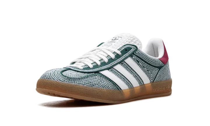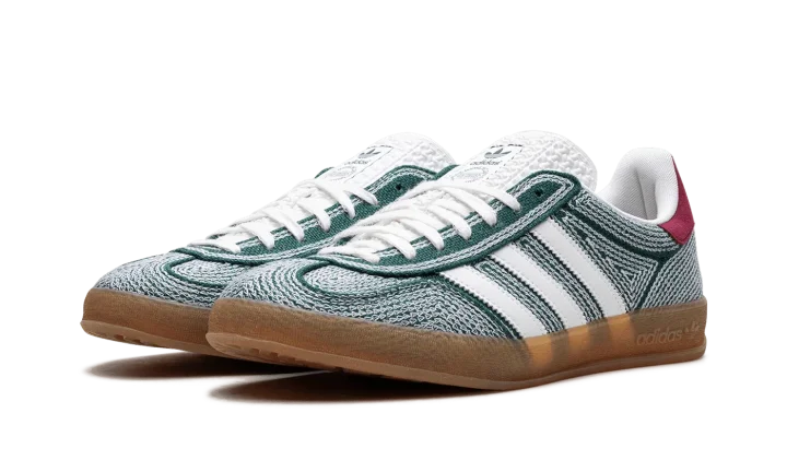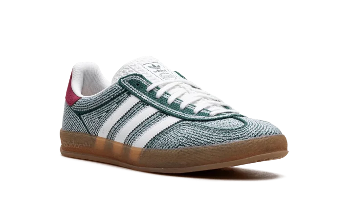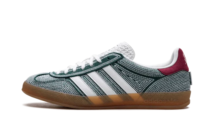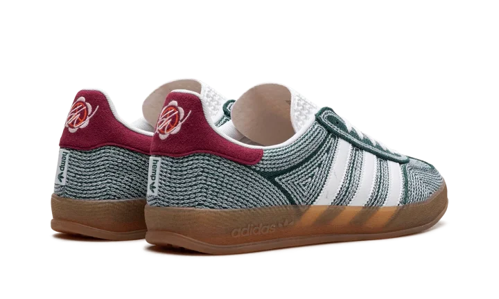 The Sean Wotherspoon x adidas Gazelle Indoor "Collegiate Green" is a collaboration by the sneaker designer and vintage clothing curator on the retro sneaker. Like Sean Wotherspoon's other collaborations with adidas, the Gazelle Indoor in "Collegiate Green" is made from vegan materials, specifically hemp. A "hemp" logo appears next to adidas's TreFoil logo on the hang tag on the lateral side. White Three Stripes are seen on both sides. The orange hemp heel tab features Wotherspoon's signature branding. Underfoot, a semi-translucent gum sole completes the look.