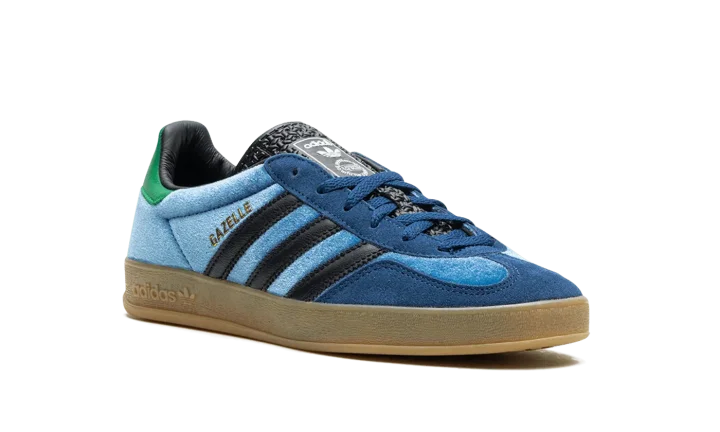 The Size? x adidas Gazelle "Navy Blue" is a collaboration by the UK-based retailer and adidas on a colorway of the classic shoe with a gradient blue appearance. The shoe's upper is complete with a gradient navy and blue suede design. Contrasting black leather Three Stripes branding can be found on the sides, while a green leather overlay appears on the heel. Gold "Gazelle" branding is stamped on the lateral side of the mid-panel and an adidas Trefoil logo is printed on the heel. Additional adidas insignia appear on the tongue. A gum rubber sole completes the look.