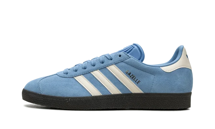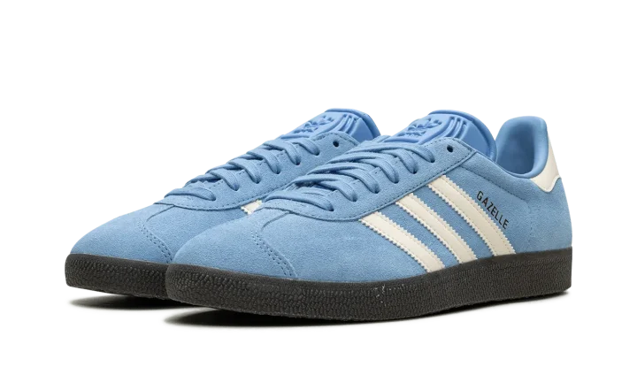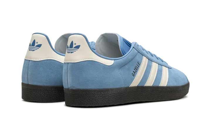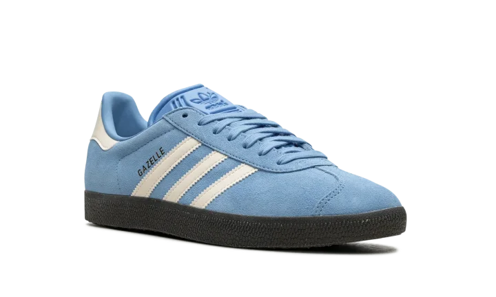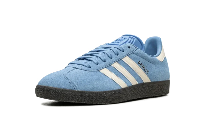 The adidas Gazelle "Sky Blue" is a colorway of the retro shoe with an eye-catching, blue-based look. The upper features a Sky Blue suede construction with Chalk White leather Three Stripes branding on the sides, and Chalk White leather on the "adidas" branded leather heel tab. Gold "Gazelle" detailing appears on the lateral side of the mid-panel, while tonal debossed adidas Trefoil branding can be found on the tongue. A dark brown gum rubber sole completes the striking colorway.