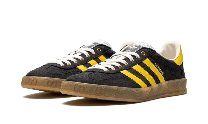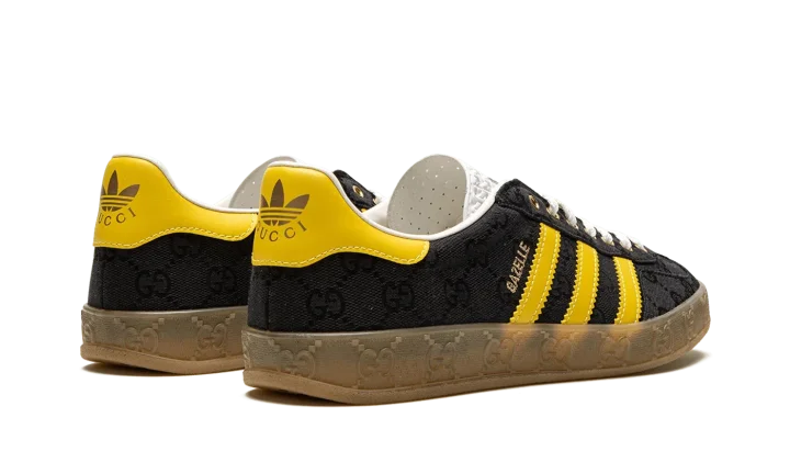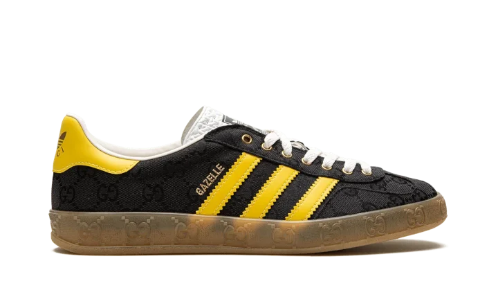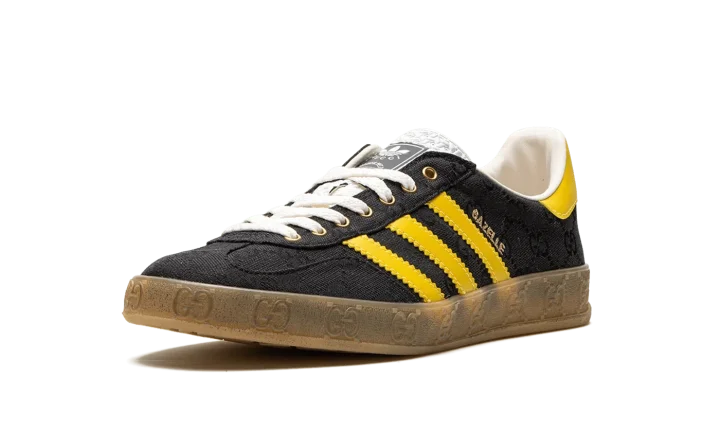 The Gucci x adidas Gazelle "Black/Yellow" is one of several limited edition colorways of the retro shoe from the collaboration between the legacy high fashion brand and adidas. Marking the second-ever collaboration between Gucci and adidas, the Gazelle in "Black/Yellow" updates the versatile sneaker with Gucci's iconic "GG" monogram patterning in an all-over style that draws favorably from 1980s-era sportswear. The shoe features yellow leather Three Stripes branding on the sides that contrasts the black canvas upper with "GG" monogram print. Co-branding is located on the tongue. "GG" embossed branding is found along the gum rubber midsole.