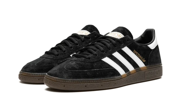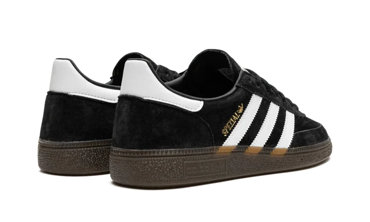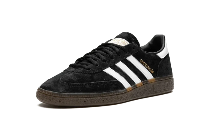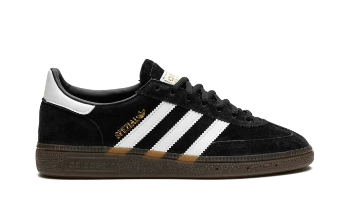 The adidas Handball Spezial "Black/White" is a versatile colorway of the retro shoe with a classic black and white color block. The construction features a black suede upper and white leather Three Stripes and gold "Spezial" branding on the side. The leather heel tab, as well as the "adidas Handball Spezial" branding on the tongue are accented in white. A dark gum rubber sole completes the look.