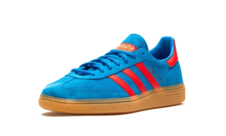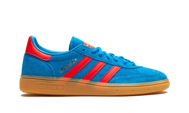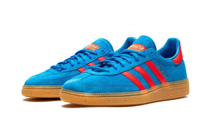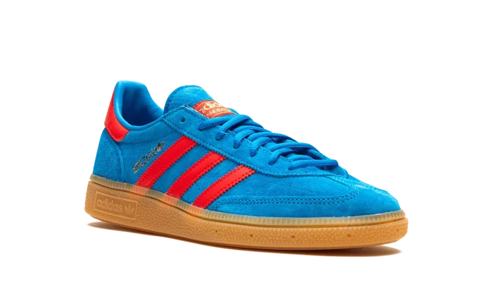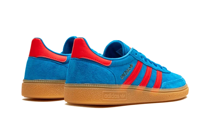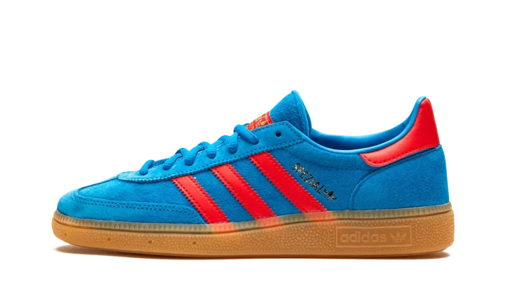 The adidas Handball Spezial "Bright Blue/Vivid Red" is a colorway of the retro shoe with a can't-miss color scheme. The colorway features a Bright Blue suede upper with Vivid Red leather Three Stripes and gold "Spezial" branding on the side. Additional Vivid Red accenting can be found on the leather heel tab and on the "adidas Handball Spezial" branding on the tongue. Underfoot, a gum sole completes the look.