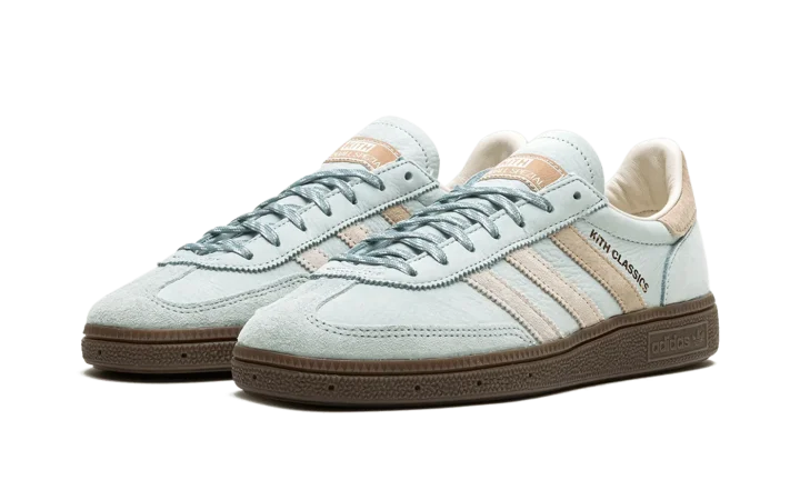 The Kith x adidas Handball Spezial "Classics Program - Amazon Green" is a colorway of the retro shoe by the popular sneaker and streetwear retailer. The adidas Handball Spezial "Classics Program - Amazon Green" by Kith is part of a larger collection of essential footwear styles designed through the lens of the New York based retailer. The upper features an Amazon Green leather design with tan leather Three Stripes branding on the sides. A "Kith Classics" logo appears on the lateral side of the mid-panel, while a tan leather overlay can be found on the heel. Classic "adidas" branding appears on the tongue. A dark gum rubber sole completes the look.