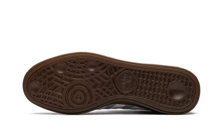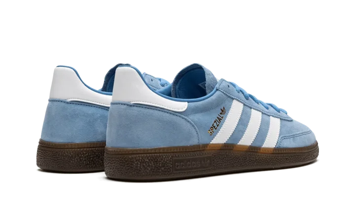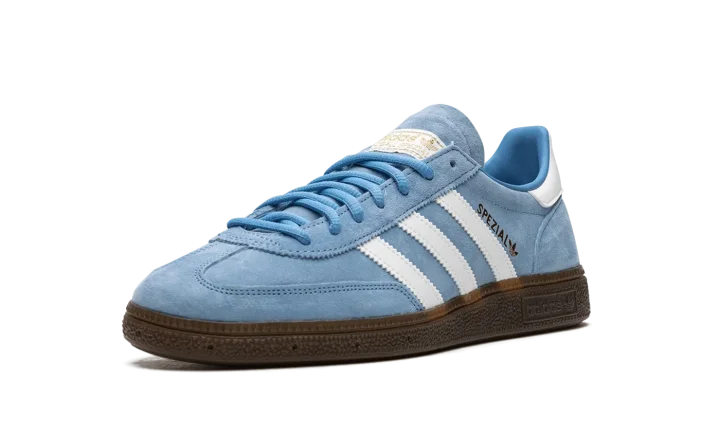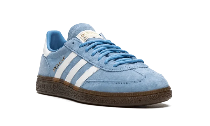 The adidas Handball Spezial "Light Blue" is an eye-grabbing colorway of the sneaker inspired by 1980s-era soccer shoes. The Handball Spezial in "Light Blue" is constructed with a light blue suede upper with white Three Stripes branding on the sides. Gold "Spezial" and adidas logos are seen on the lateral side of the mid-panel. A white leather overlay is seen on the heel. Classic adidas Handball Spezial branding is printed in gold lettering on the tongue. A gum rubber sole completes the look.