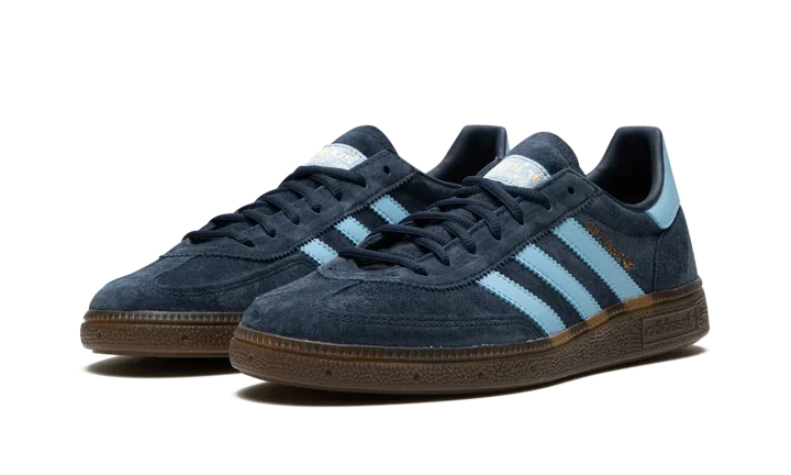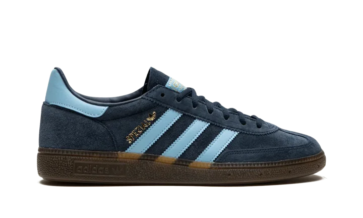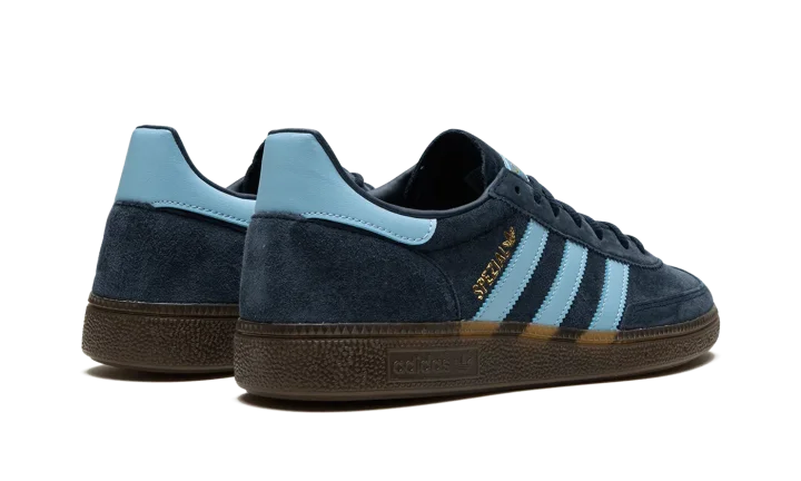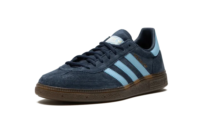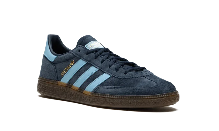 The adidas Handball Spezial "Navy/Gum" is a navy blue colorway of the shoe inspired by 1980s-era soccer sneakers. The Handball Spezial in "Navy/Gum" features a navy blue suede design with light blue leather Three Stripes branding on the sides. Gold "Spezial" and adidas logos appear next to the Three Stripes on the lateral side of the profile. Additional classic adidas detailing can be found on the tongue. A gum rubber sole completes the look.