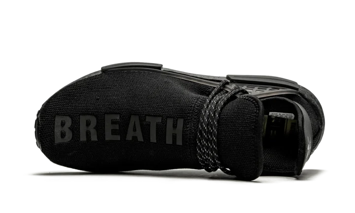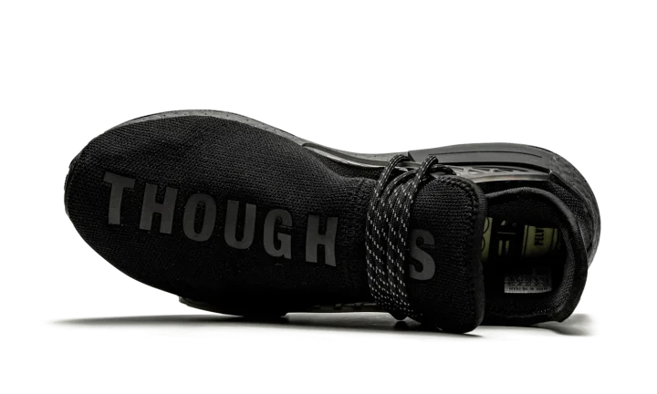 The Pharrell x adidas NMD Hu "Black Future" is one of several black monochromatic designs imagined by the Virginia native and adidas for the "Black Future" collection. Inspiration for "Black Future" stems from a quote Pharrell lent to TIME Magazine for an article titled "We Deserve a Black Future". Adidas dresses the upper in a stealthy black sock-like Primeknit material that is both breathable and supportive in structure. Black speckled rope laces are held in place by a tonal TPU caging system anchored by midsole blocks. Two introspective slogans, "THOUGHTS" and "BREATHE," are printed on the top of the left and right shoe, respectively. Co-branding dots the heel overlay. Adidas's responsive Boost cushioning is painted black in this instance as a continuation of the model's black monochromatic design.