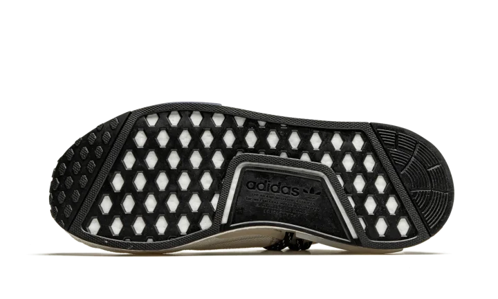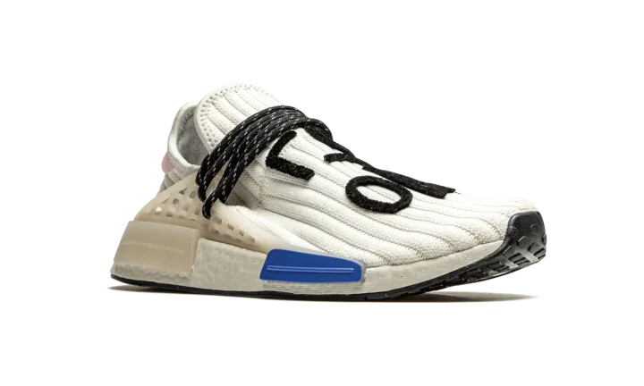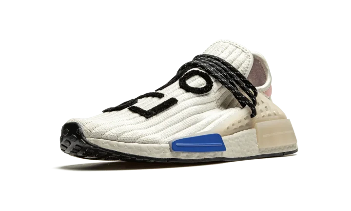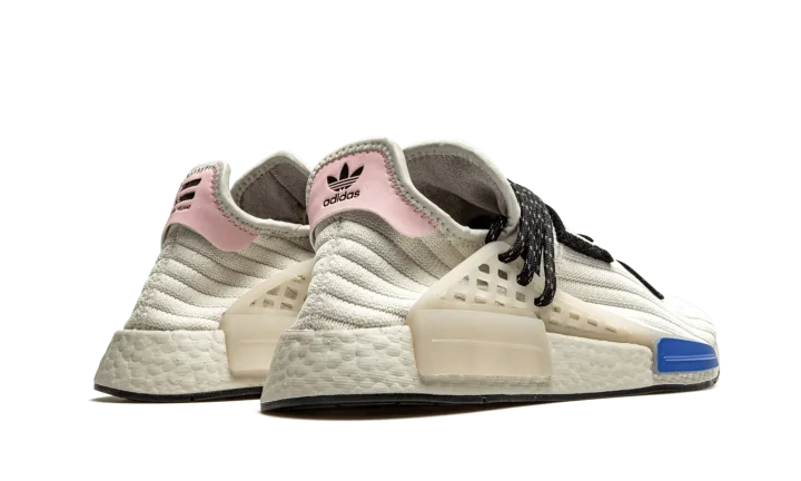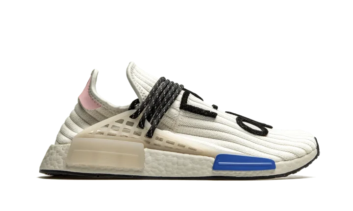 The Pharrell x adidas NMD Hu "Cream" is a February 2021 release of the music artist's beloved low-top shoe with a reimagined knit based construction. A cream ribbed knit upper replaces the Primeknit fabric found on earlier NMD Hu releases. The sweater-like material is contrasted by a pink leather heel tab with adidas and Pharrell branding. Reflective black speckled rope laces give the colorway an element of ruggedness. Black felt "Human Race" detailing in Korean is stitched onto the top of the shoe. The previously mentioned rope laces are held in place by a semi-translucent TPU caging system that is anchored by midsole inserts. A white Boost foam midsole finishes off the look of this premium offering from Pharrell Williams and adidas.