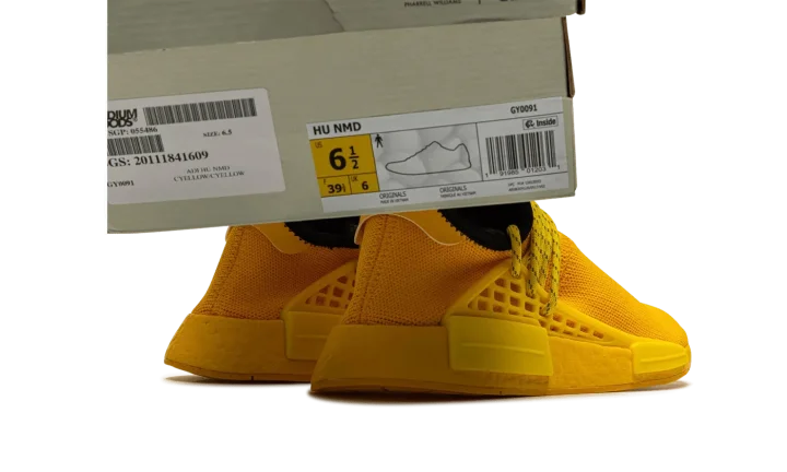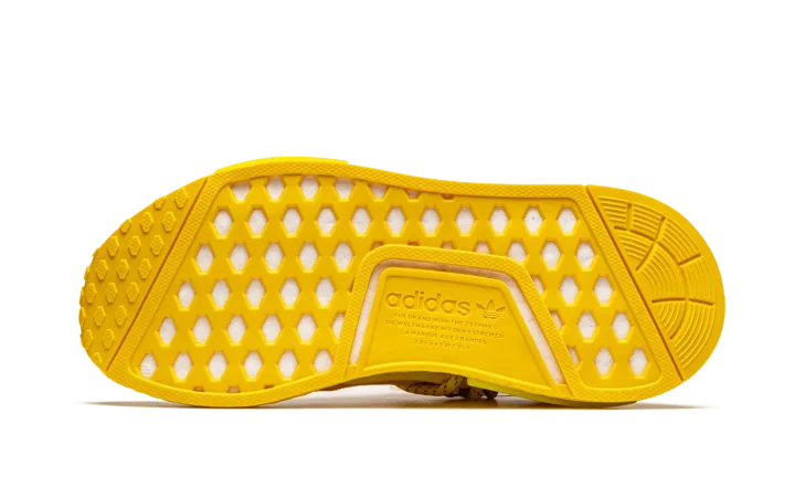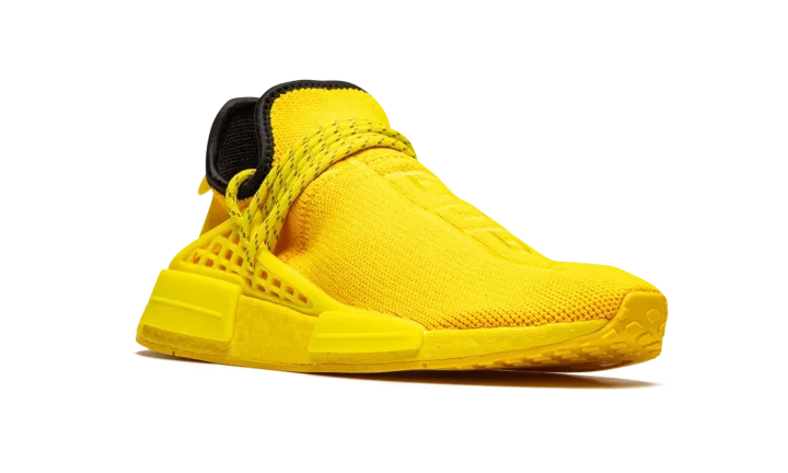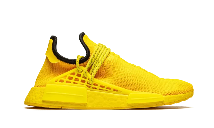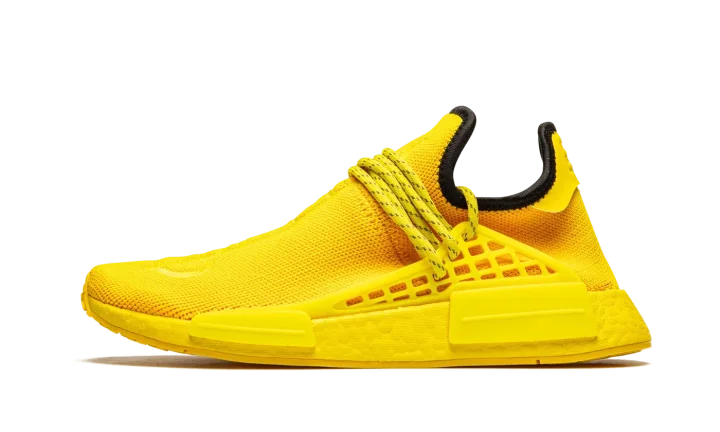 The Pharrell x adidas Hu NMD "Bold Gold" is a November 2020 release of Pharrell Williams' popular shoe in an all-yellow-everything colorway. The "Bold Gold" is indeed as exuberant as its nickname implies. The entire upper wears an attention grabbing yellow Primeknit material that is both lightweight and breathable. Tonal Hindi text embroidered on the top of both shoes translates to "Human Race". Additional design elements include striped yellow rope laces that are held in place by a tonal supportive TPU caging system that is anchored by midsole inserts. Dual adidas and Pharrell branding can be found on the heel of the left and right shoe, respectively. A black liner and yellow-tinted Boost foam midsole complete the look of this exciting look for the Pharrell x adidas Hu NMD.
