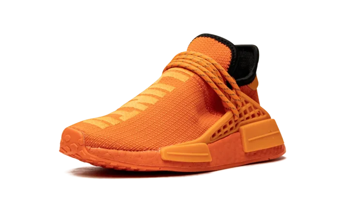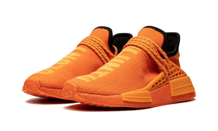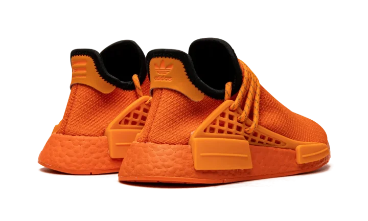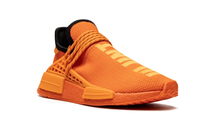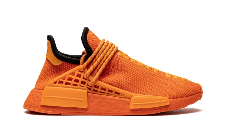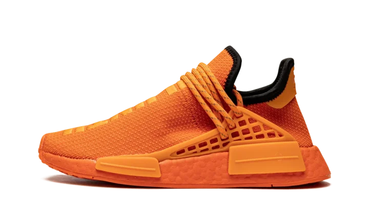 The Pharrell x adidas NMD Hu "Orange" is another monochromatic colorway of the Virgina native's trail-inspired signature shoe to release in 2021. Where early iterations of the NMD Hu became known for loud, colorful designs, versions of the shoe released by adidas since January 2021 have featured monochromatic colorways, a refreshing shift in design that progresses the popular lifestyle shoe. The "Orange" features an orange Primeknit construction with orange speckled rope laces held in place by a tonal supportive TPU caging structure that is anchored by midsole inserts. The "ULUNTU" branding on the top of the foot appears in a slightly lighter shade of orange than the aforementioned woven upper. Dual Pharrell and adidas branding can be found on the heel. Adidas paints the Boost cushioned midsole orange to complete the monochromatic orange look of this summer-ready NMD Hu.