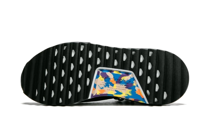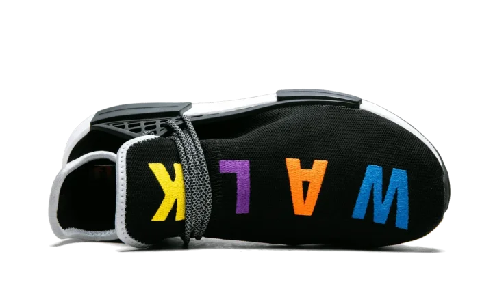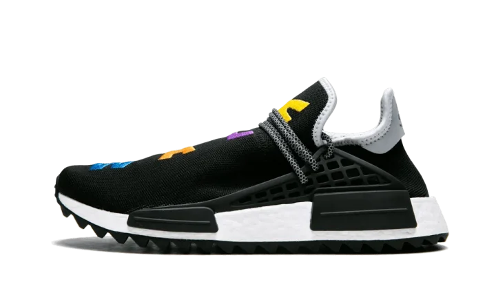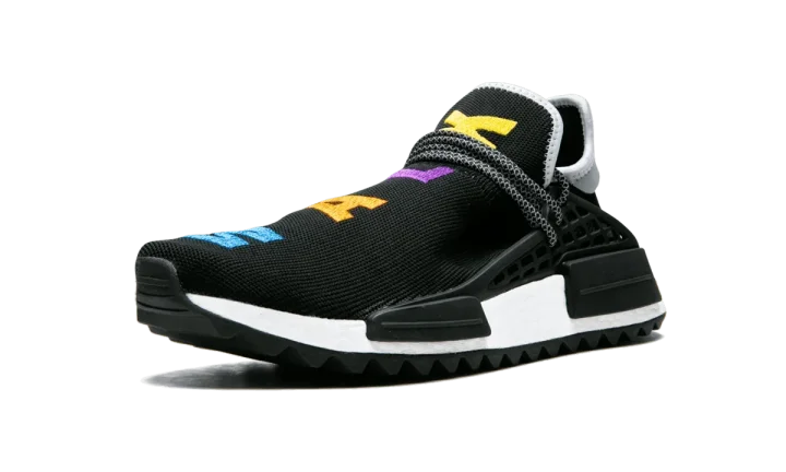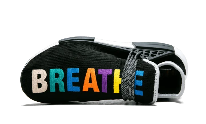 The Pharrell x adidas NMD Hu TR "Friends and Family" is an extremely exclusive colorway of Pharrell Williams's popular silhouette. This NMD Hu TR has a black mesh upper, and the text running across the top of each shoe reads "BREATHE" and "WALK" in multicolored embroidery. More color is added to the outsole, which has a unique multicolor marbled treatment on the rubber panel at the arch. Reflective laces and heel tabs add even more flash to the striking colorway. This special edition Pharrell x adidas NMD Hu TR "Friends and Family" was created in 2018 and never released at retail. It was only made available to members of the pop culture icon's inner circle.