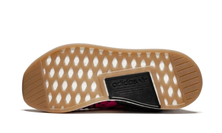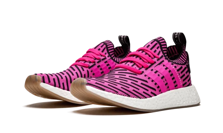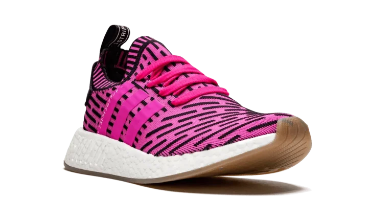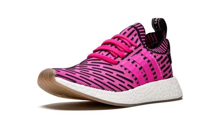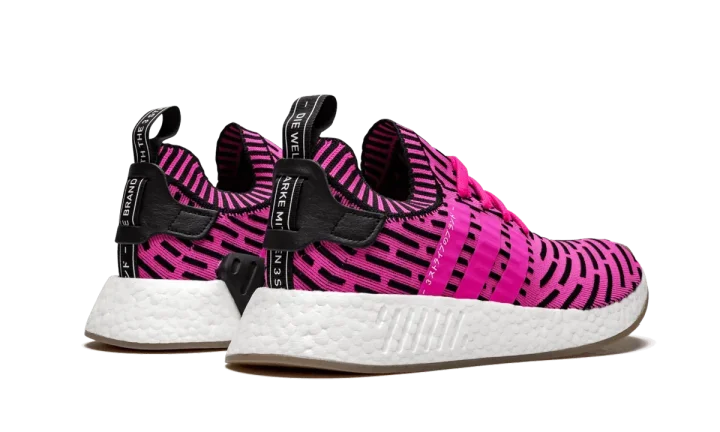 This adidas NMD_R2 PK is a bold take on the ultramodern adidas shoe. A shock pink Primeknit upper features core black stripes. The adidas three stripes branding incorporates Japanese text. A Boost midsole provides a responsive, energy-returning feel. The gum outsole adds a classic running touch.