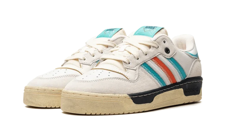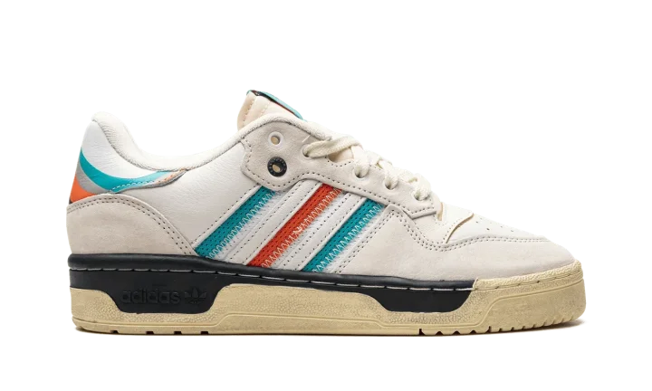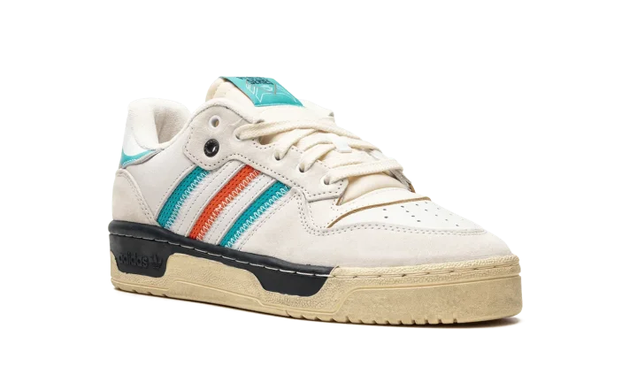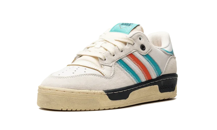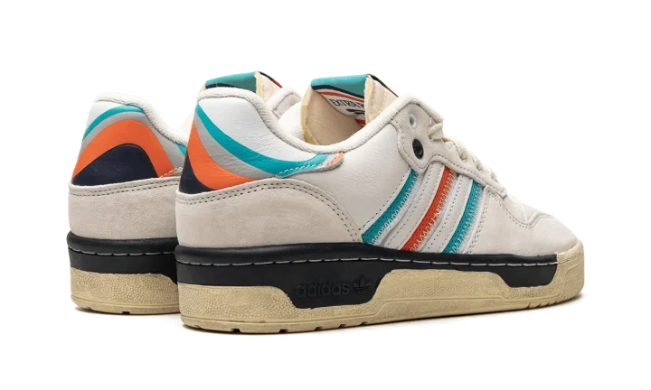 The Extra Butter x adidas Rivalry Low "Islanders" is a collaboration by the New York based retailer on a colorway of the retro basketball sneaker inspired by the New York Islanders hockey team. The "Islanders" adidas Rivalry Low salutes one of New York's two NHL teams with its color scheme. The shoe has an off-white leather and suede construction with blue and orange accents. More specifically, blue and orange leather Three Stripes branding can be seen on the sides while "Rivalry Series" branding is located on the tongue. An Islanders-inspired wave of colors is debossed on the heel tab. Underfoot, an aged-looking midsole gives the sneaker a retro touch.
