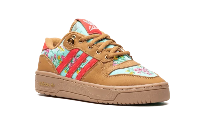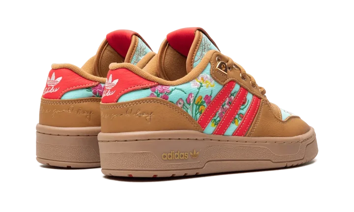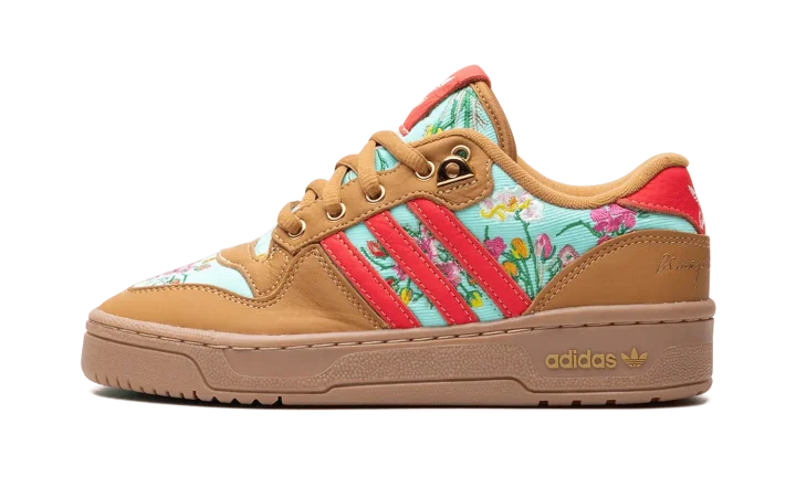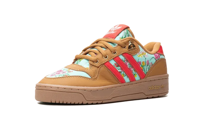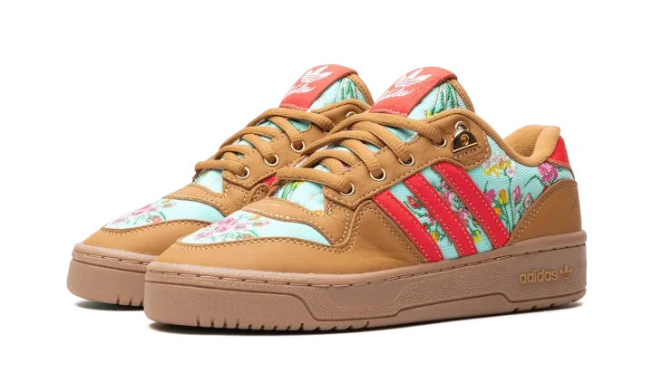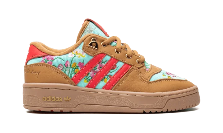 The Unheard Of x adidas Rivalry Lo "Mom's Ugly Couch" is a collaboration by the Cincinnati, Ohio based retailer and adidas on a colorway of the retro basketball shoe with an interesting backstory. The colorway is inspired by Unheard Of founder and owner Phil Lipschutz's journey, which started with him sleeping on his grandmother and mother's couches and has now led to his very own adidas collaboration. As for the design of the shoe, the upper features an embroidered floral motif on the teal canvas base and tongue inspired by the look of vintage couches. The overlays are designed in tan tumbled leather. Contrasting red leather Three Stripes branding appears on the sides. Gold accents are found on the eyelets, lace tips, lace dubrae, and on the branding on the heel. Underfoot, a brown gum sole completes the look.