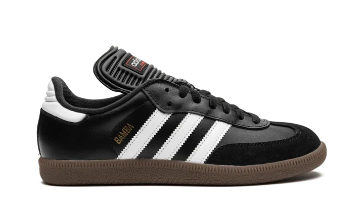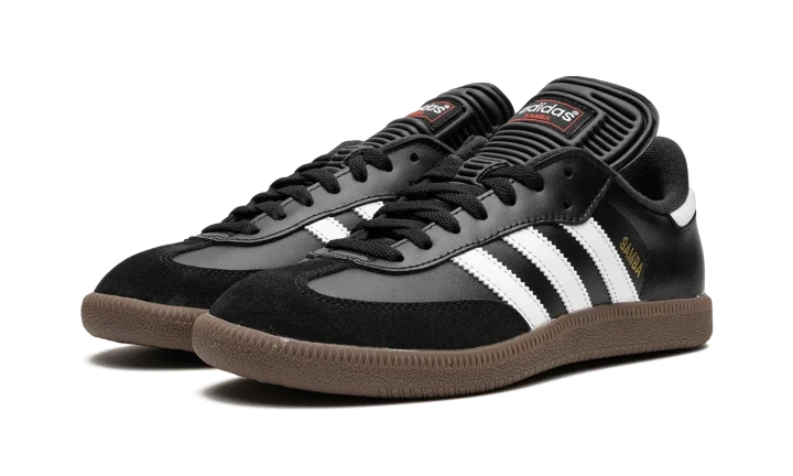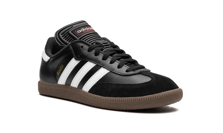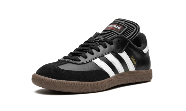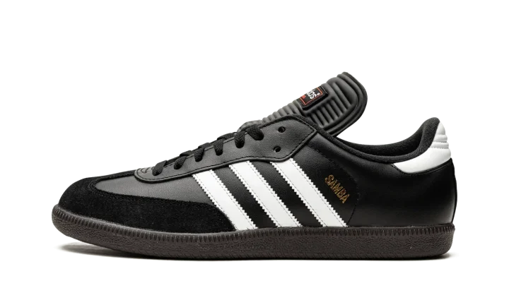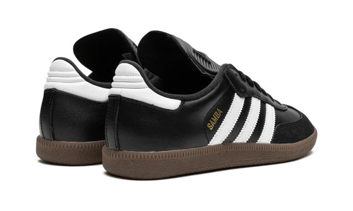 The adidas Samba "Black" is a mostly monochromatic black colorway of the easy-wearing lifestyle shoe. The Samba has enjoyed a resurgence in popularity in recent years, with more and more people from all walks of life coming to appreciate the model's timeless looks, comfort, and versatility, especially in the "Black" makeup. The upper features a black leather construction with tonal suede overlays on the toe and forefoot. White Three Stripes branding is found on the sides. "Samba" detailing appears in gold foil lettering on the lateral side of the shoe and an "adidas Samba" can be found on the tongue. A dark gum rubber sole completes the look.