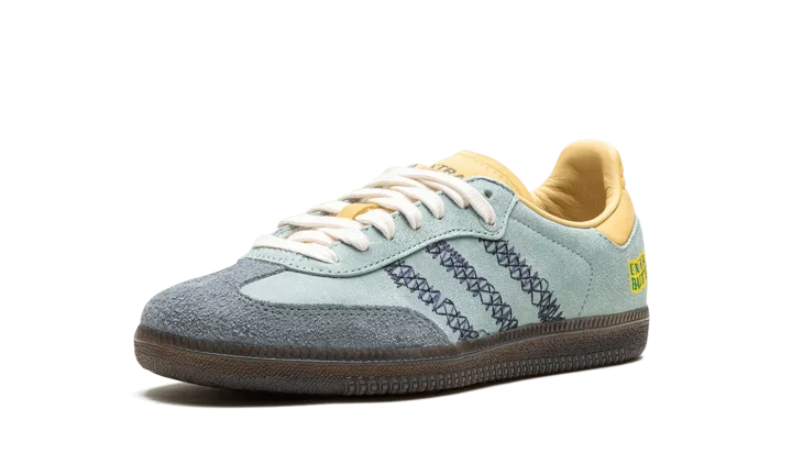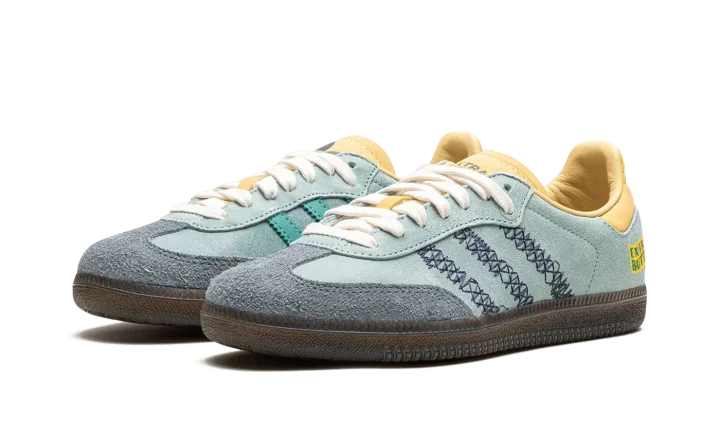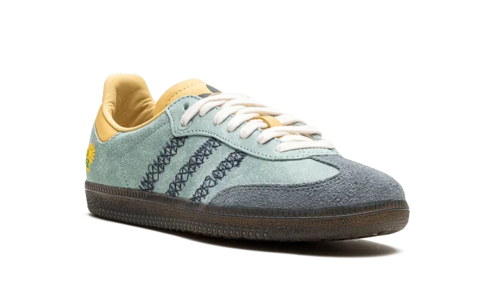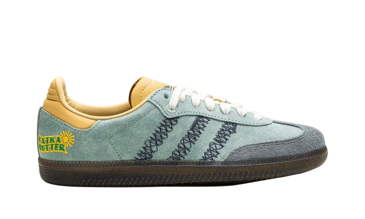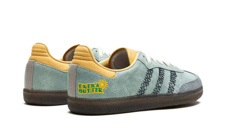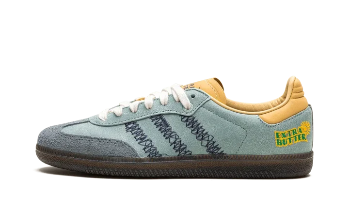 The Extra Butter x adidas Samba "Consortium Cup" is a collaboration by the New York City based retailer on a colorway of the retro sneaker made from premium materials and a keen attention to detail. Extra Butter's adidas Samba is one of several colorways of the model from the "Consortium Cup" of collaborations, which also includes colorways by Sneaker Politics, Footpatrol, and Nice Kicks. The upper features a dusty teal suede construction with dark grey suede on the toe. An "Extra Butter" logo with a sunshine graphic is embroidered on the lateral side of the heel while over-stitched Three Stripes branding appears on the sides. A classic "adidas" logo is found on the tongue. Underfoot, a dark brown gum sole completes the look.