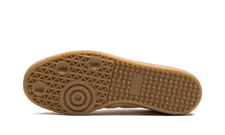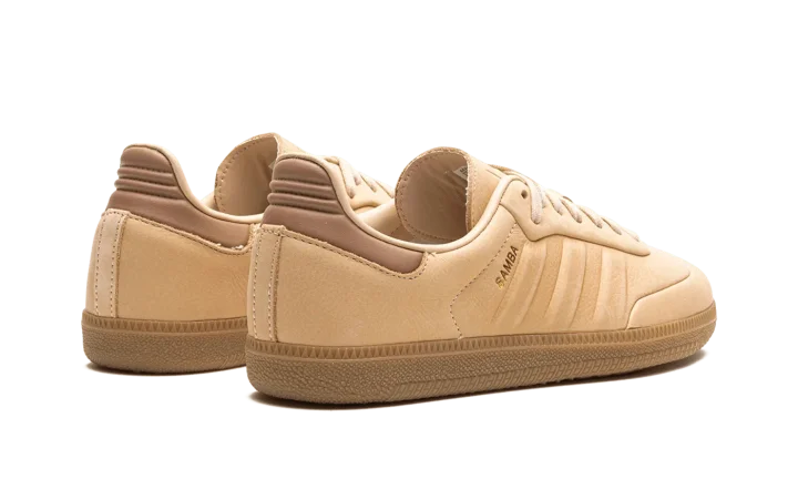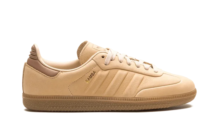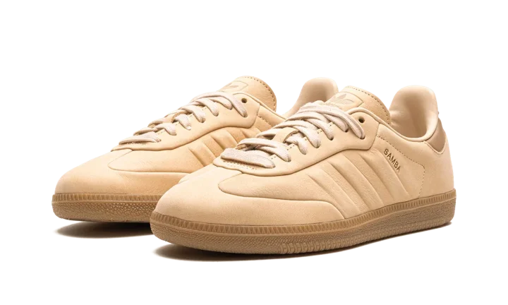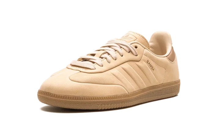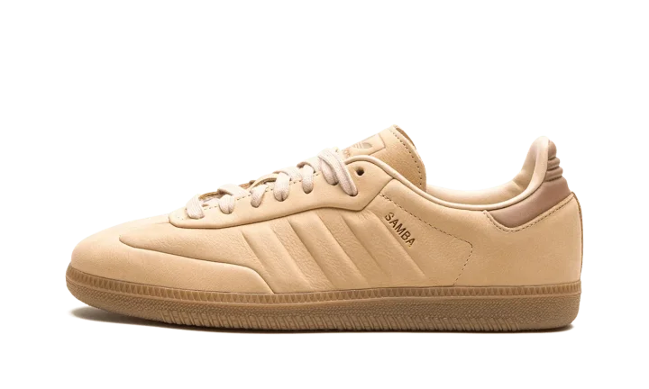 The adidas Samba "Halo Blush" is a monochromatic beige colorway of the casual sneaker with a premium construction. The Samba enjoyed a resurgence in popularity beginning in 2021 and 2022, and is now considered one of the most recognizable sneakers in the world. Here, the "Halo Blush" colorway features an all-beige leather construction with tonal leather overlays and molded Three Stripes detailing on either side. A small gold "Samba" logo is located on the lateral side of the shoe near the aforementioned Three Stripes. "Adidas Samba" detailing can be found on the tongue. A gum rubber sole completes the clean look.