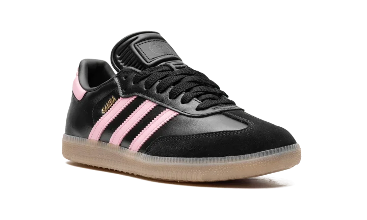 The adidas Samba OG "Inter Miami - Black" is a colorway of the popular retro shoe inspired by the Major League Soccer team. Also said to be inspired by Inter Miami's star player, football (soccer) legend Lionel Messi, the "Inter Miami" features the colors of the Miami-based team on its design. The upper has a black leather construction with pink leather Three Stripes branding. A gold "Samba" logo appears on the lateral side of the mid-panel, while detailing inspired by Inter Miami is located on the tongue. A semi-translucent, smoky Gum rubber sole completes the look.