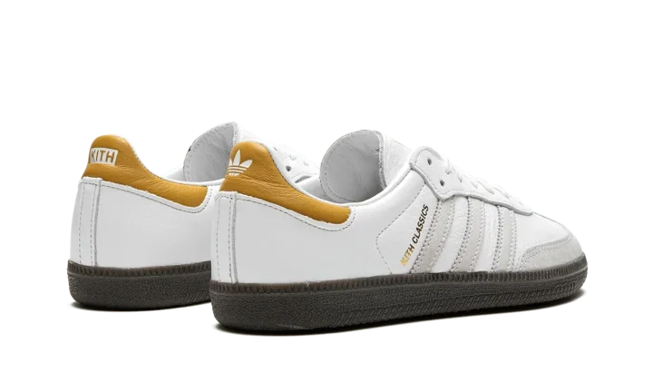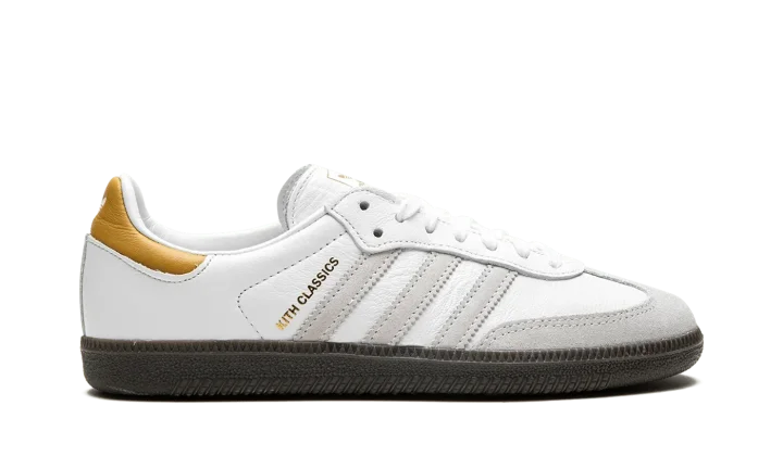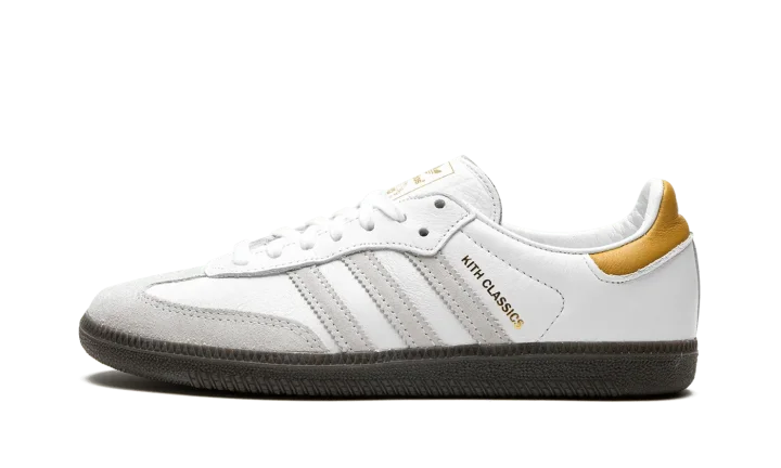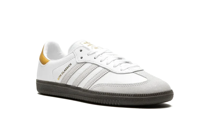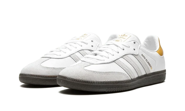 The Kith x adidas Samba "White/Grey/Gold" is a collaboration between Ronnie Fieg's sneaker boutique and adidas on a premium colorway of the classic indoor soccer shoe. Keeping the shoe's timeless appearance mostly intact, Kith's adidas Samba features a white leather construction with contrasting grey suede Three Stripes branding on the sides and grey suede on the toe. Gold "Kith Classics" detailing is found along the side of the branding. Dual "Kith" and adidas branding is found on the tongue. Gold accenting appears on the leather heel tab with adidas's signature logo. Underfoot, a black rubber sole completes the look.