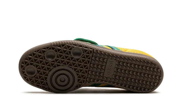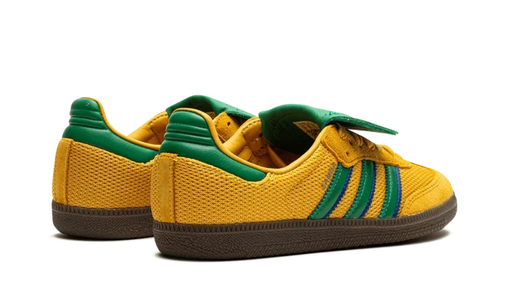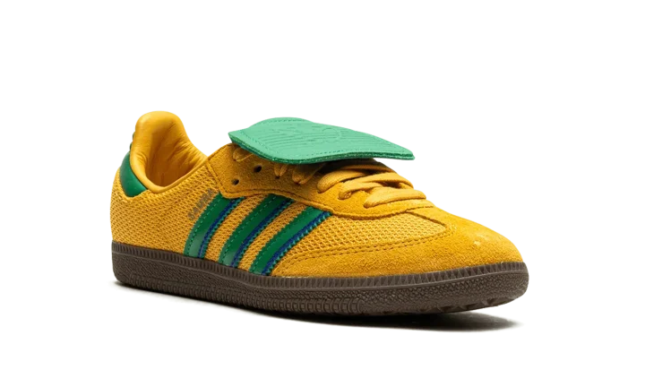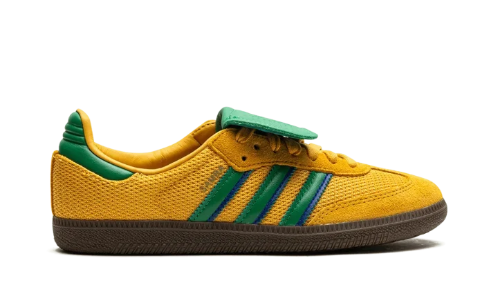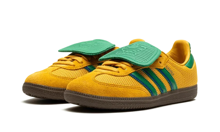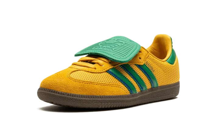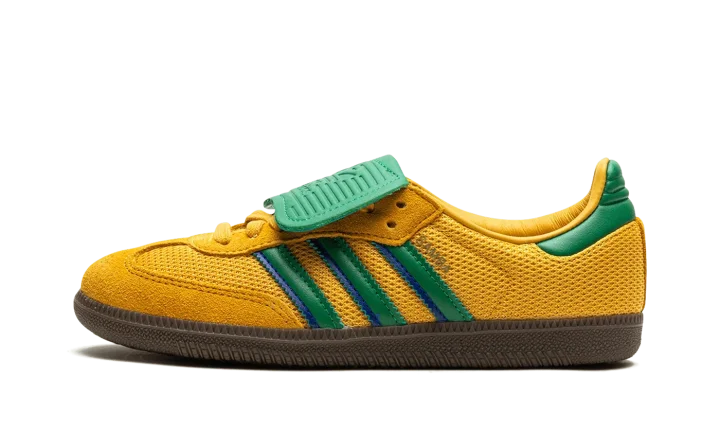 The adidas Samba LT "Preloved Yellow" is a unique colorway of the popular silhouette with a mesh construction and other eye-catching features. The "Preloved Yellow" is complete with a Preloved Yellow mesh upper and green and blue Three Stripes branding on the sides. A classic "Samba" logo appears on the lateral side of the midfoot, while green leather can be found on the heel. The foldover-style green tongue nods to the Samba's soccer shoe roots. A dark gum rubber sole completes the look.