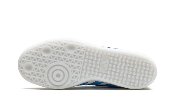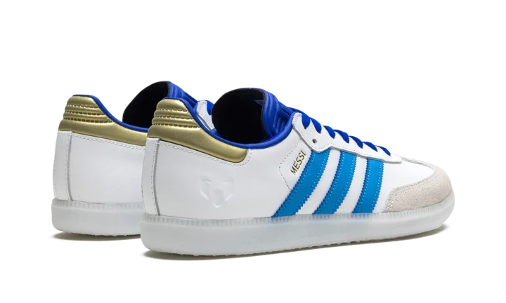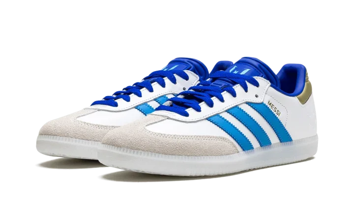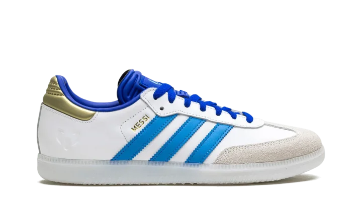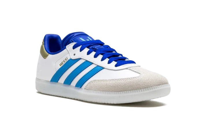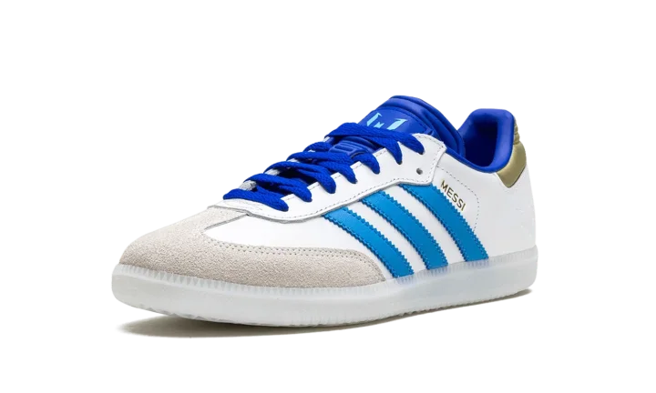 The Lionel Messi x adidas Samba Indoor "Argentina" is a collaboration between the soccer icon and adidas on the classic indoor soccer shoe. The adidas Samba "Argentina" is inspired by both the legendary soccer—or football, depending on where in the world you are—player and his home country. More specifically, the shoe is heavily inspired by the World Cup Trophy Messi won during the 2022 Qatar FIFA World Cup. The upper features a white leather base with two shades of blue inspired by Argentina's kits (uniforms) in the aforementioned World Cup. Gold "Messi" branding appears on the lateral side by the blue Three Stripes and on the heel. An icy blue translucent rubber sole completes the look.
