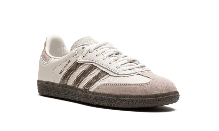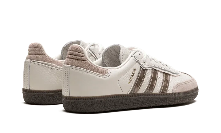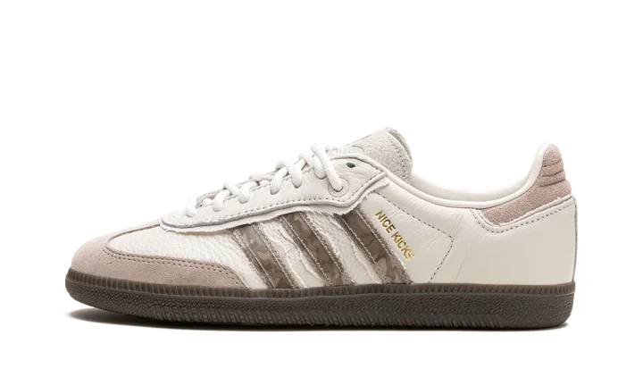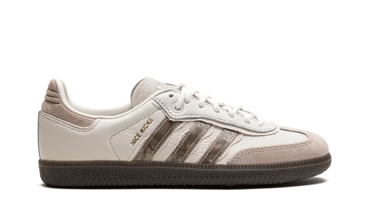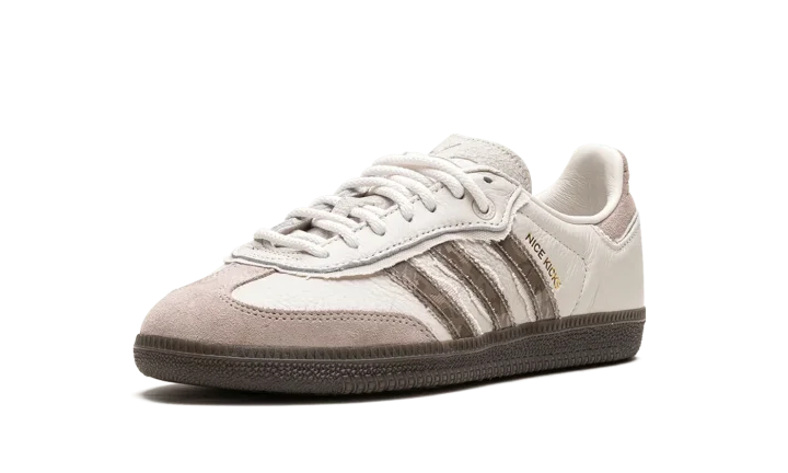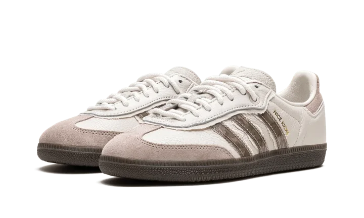 The Nice Kicks x adidas Samba "Consortium Cup" is a collaboration between the sneaker media company and adidas on a colorway of the retro sneaker made with premium materials and a keen attention to detail. Nice Kicks' adidas Samba is one of several colorways of the Samba from the "Consortium Cup" of collaborations, which also includes colorways by Sneaker Politics, Footpatrol, and Extra Butter. As for the shoe at hand, the upper features a white tumbled leather construction with tan suede overlays on the toe and heel. The Three Stripes branding on either side of the shoe has frayed edges, and a gold "Nice Kicks" logo appears on the lateral side of the mid-panel. Dual branding can be found on the tongue and insole. An adidas Consortium hangtag completes the look.