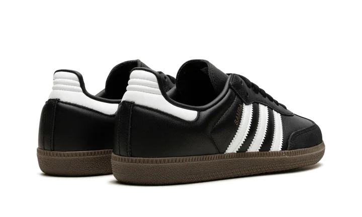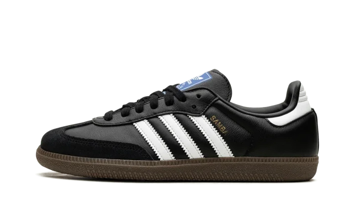 The adidas Samba OG is a low-top silhouette born on the indoor soccer field. The classic silhouette sports a black leather upper with suede overlays on the toe and heel. Contrasting white leather brings attention to the Three Stripes on each side panel and heel tab. A blue logo stamped on each tongue and "Samba" written in gold foil on each side panel act as signature branding hits. The soccer shoe sits atop a brown rubber outsole.