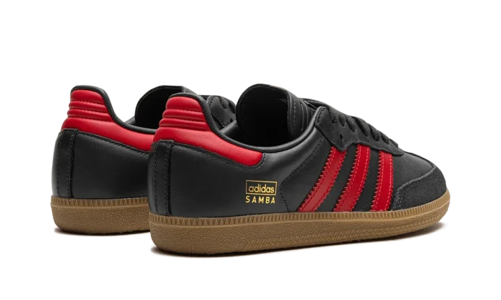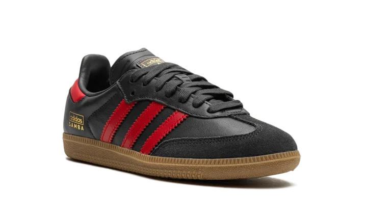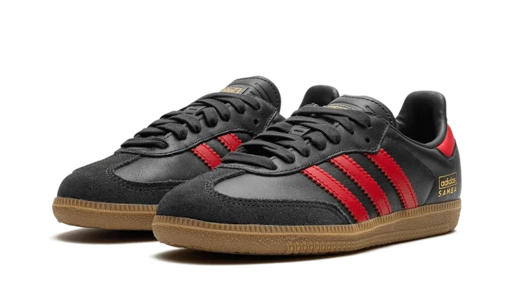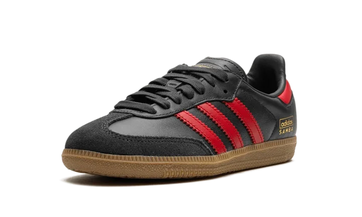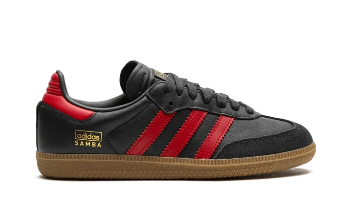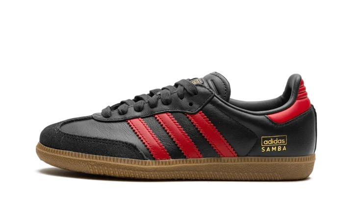 The adidas Samba OG "Carbon/Better Scarlet" is a mostly two-tone, black-and-red colorway of the classic shoe. The adidas Samba originated as a performance soccer shoe before becoming one of the most popular lifestyle sneakers in the world in the present day. On the "Carbon/Better Scarlet," the upper has a Carbon leather construction with a tonal suede overlay on the toe. Better Scarlet-colored leather Three Stripes branding appears on both sides. Additional Better Scarlet detailing appears on the leather heel tab. A gold "adidas Samba" logo is stamped on the lateral side of the heel. A gum rubber sole completes the look.