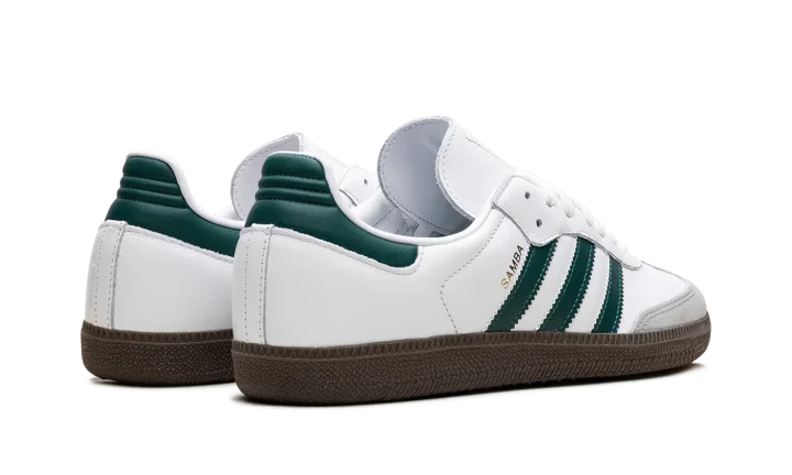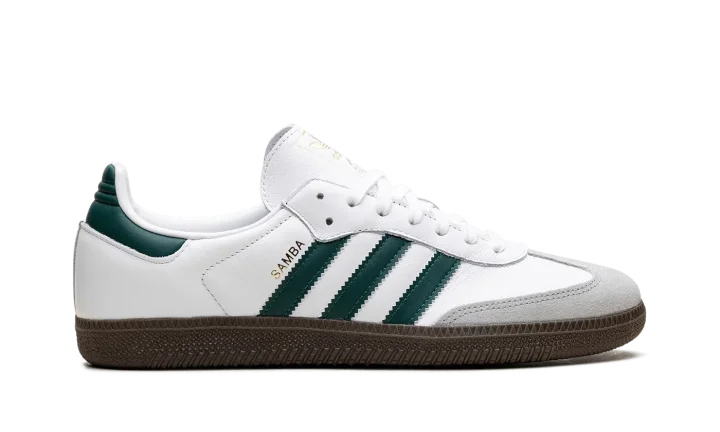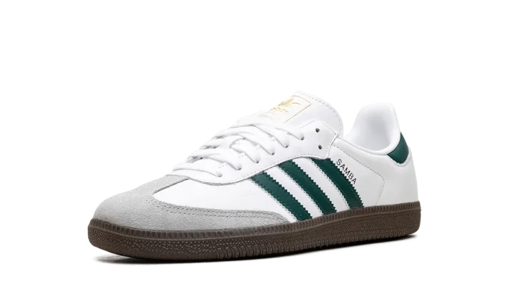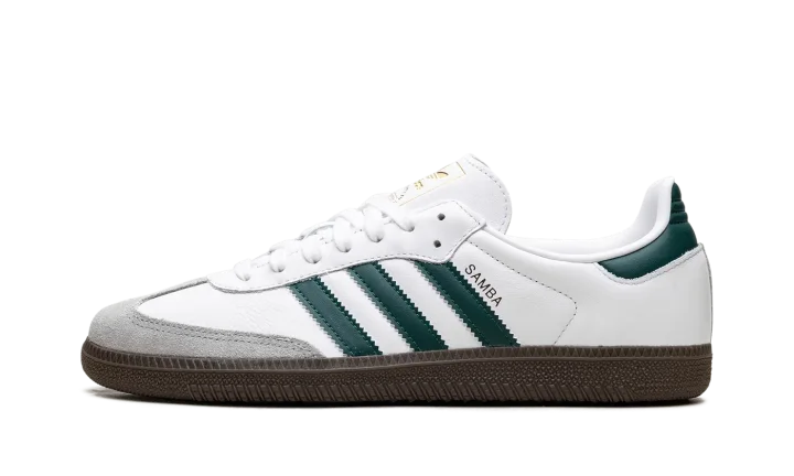 Step into a clean and classic look with the Adidas Samba OG "Cloud White / Collegiate Green". This celebrated silhouette features a crisp white leather upper with striking green Three Stripes and a matching heel tab. Enjoy the comfortable fit and timeless appeal, blending a retro aesthetic with modern style for a versatile look that's perfect for any occasion.