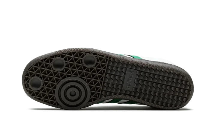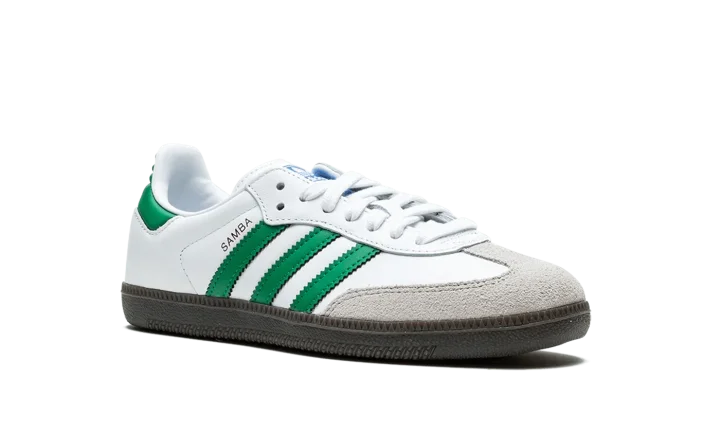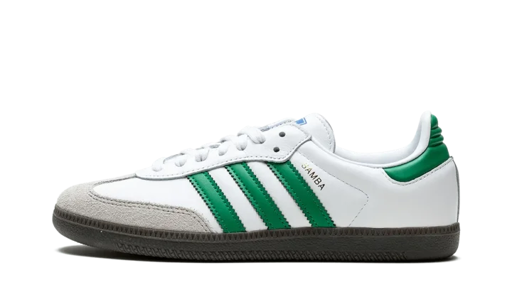 The adidas Samba OG "White/Green" is a colorway of the retro sneaker with a classic, two-tone color block. The adidas Samba is one of the most popular sneakers in the game, and certainly one of the most wearable, too, as evidenced by this easy to style colorway. The upper is complete with a white leather base and green leather Three Stripes branding on the sides. A gold foil "Samba" logo appears on the lateral side of the midfoot. Classic "adidas" detailing can be found on the tongue. Underfoot, a black rubber sole puts the finishing touch on the design.