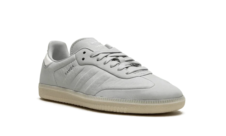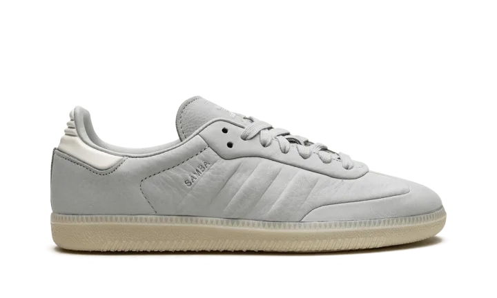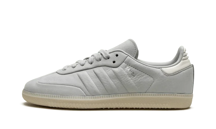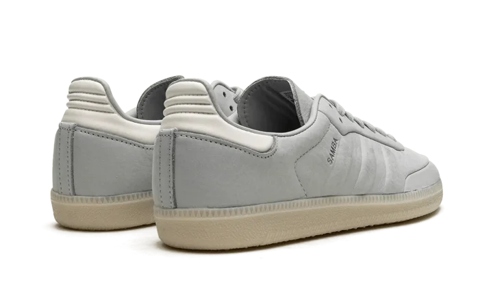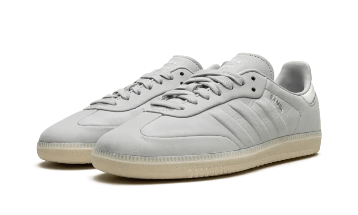 The adidas Samba "Wonder Silver" is a minimalist colorway on the retro indoor soccer sneaker with a unique design. The colorway features a Wonder Silver-colored leather construction with tonal Three Stripes on the sides and tonal overlays on the toe and forefoot. "Samba" branding appears next to the raised Three Stripes logo on the lateral side of the shoe. Debossed "adidas" detailing appears on the tongue. A semi-translucent gum rubber sole completes the look of the versatile and casual colorway.