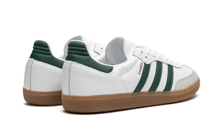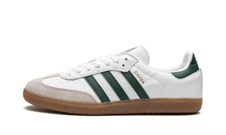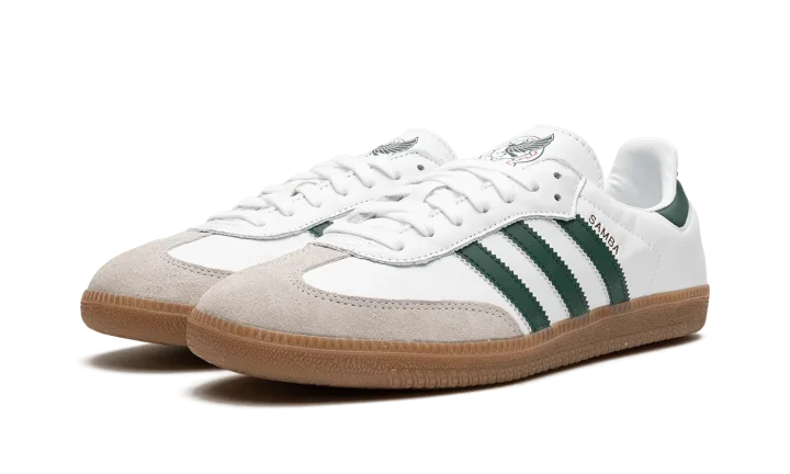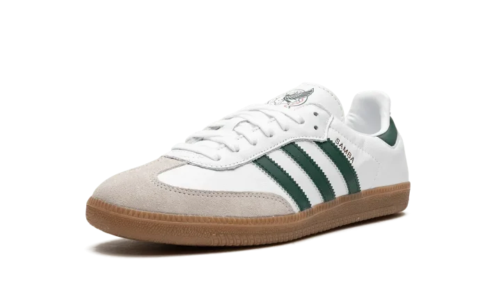 The adidas Samba "Mexico" is a colorway of the retro indoor soccer shoe inspired by Mexico's home soccer jerseys. A clean look for the ultra popular Samba, the "Mexico" celebrates Mexico's national soccer club and features a white leather design with green leather Three Stripes branding on the sides. Gold "Samba" detailing appears next to the classic logo. Mexico's team logo is printed on the white leather tongue, giving the shoe a unique look. A gum rubber sole completes the design.