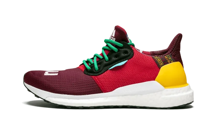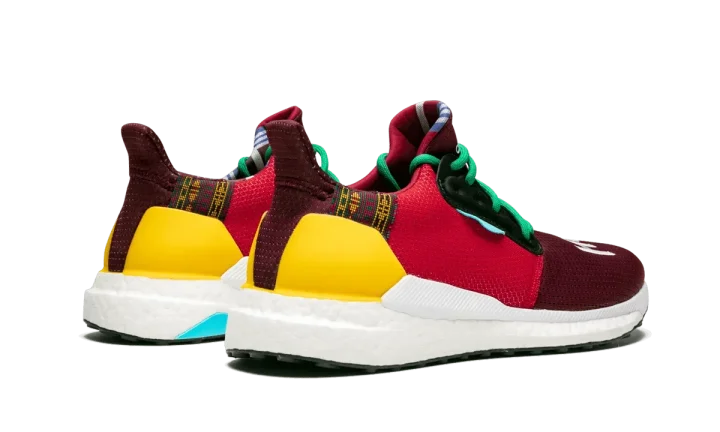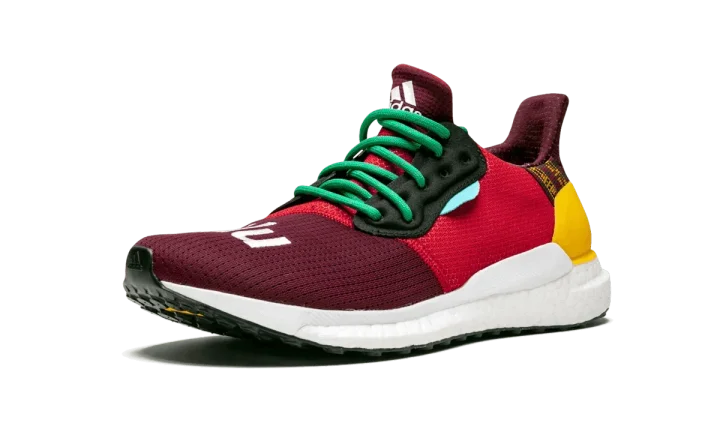 The Pharrell Williams x adidas Solar Hu Glide "Friends and Family" is a rare colorway of the running shoe design that was only given to friends and family of adidas and the pop icon. An alternate take on the three colorways of the shoe that released at retail, the color palette is rearranged to feature a maroon and bright red mesh upper with yellow accents and green laces (additional lace options are also included). "Hu" is embroidered in white on each toe box to complete the upper, and the Solar Hu Glide sits atop a full-length Boost foam sole.