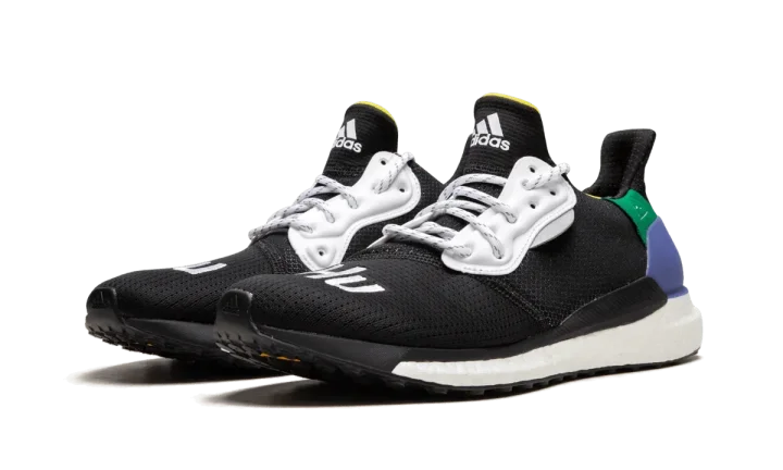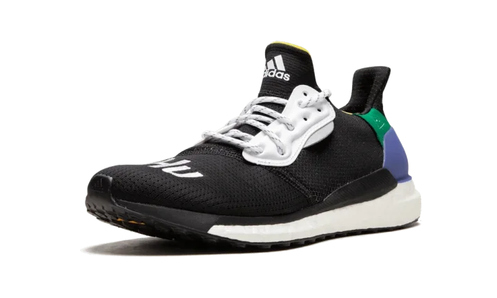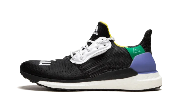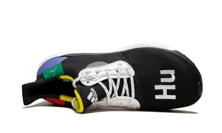 The Pharrell x adidas Solar Hu Glide "Black" from 2018 is another impressive creation from Pharrell Williams and the Three Stripes. Taking inspiration from the UltraBoost runner, the Solar Hu Glide continues the momentum of the style and music icon's popular NMD Hu line. The shoe is built with a sock-like upper and a full-length Boost cushioning platform, along with distinct details from Pharrell. The Pharrell x adidas Solar Hu Glide "Black" has a black mesh upper and a unique lacing system. Pops of blue, green, yellow, and red add a vibrant splash of color. The finishing touch is Pharrell's familiar "Hu" branding embroidered on each toe.
