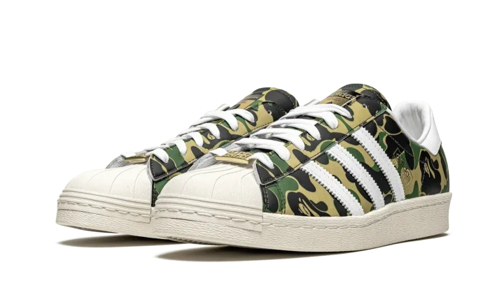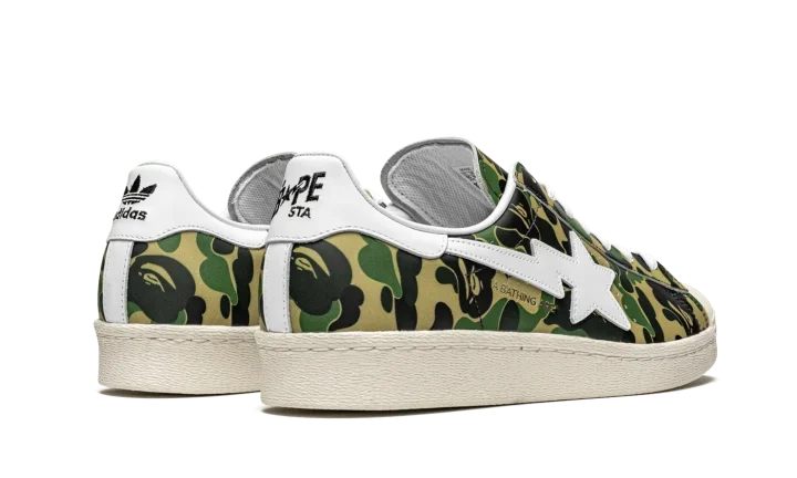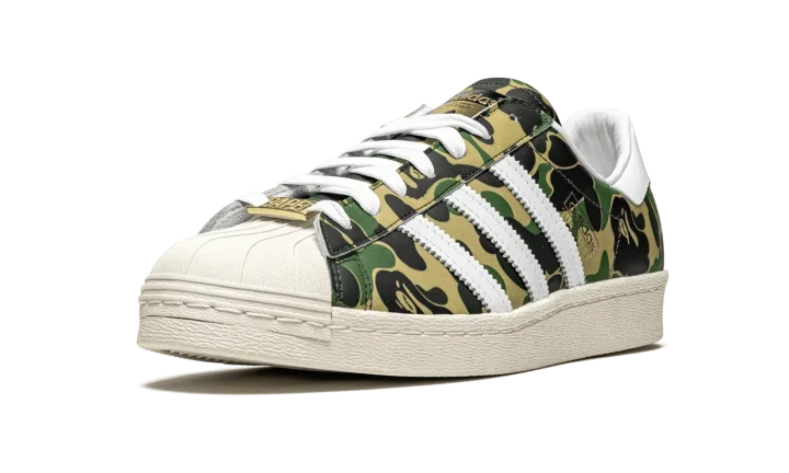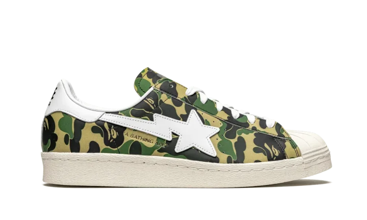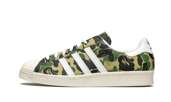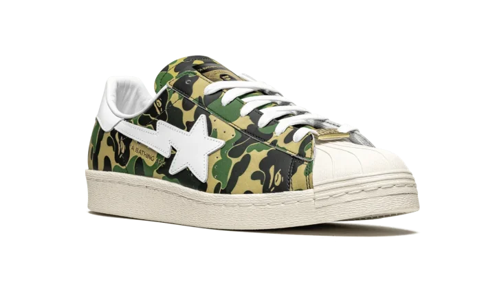 The Superstar 'BAPE - Green Camo' shoe features a classic Adidas Superstar style with a unique BAPE green camouflage print, offering a bold and distinctive look.