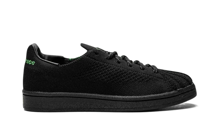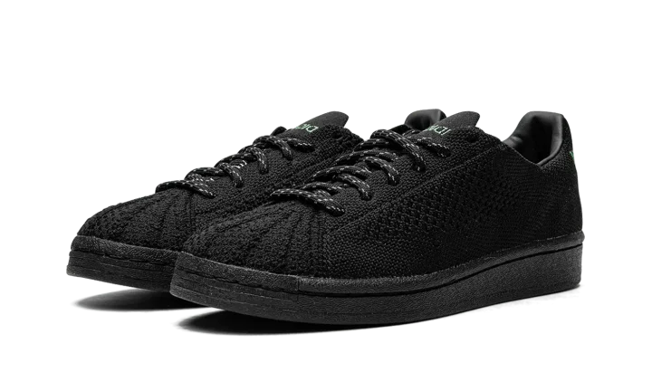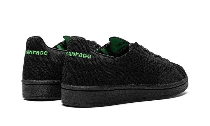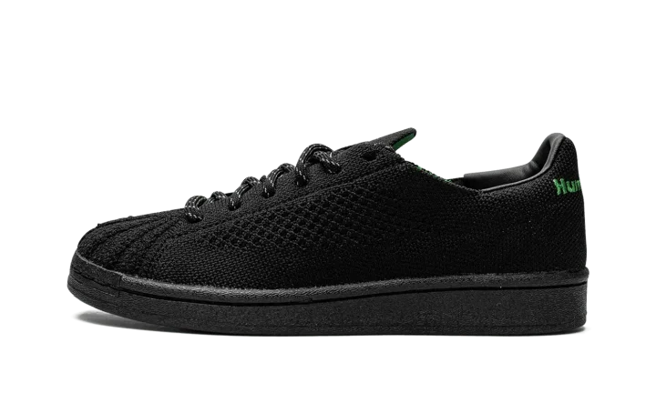 The Superstar Primeknit 'Pharrell Black' shoe combines classic Adidas Superstar style with a breathable Primeknit upper, designed in collaboration with Pharrell Williams for a modern and comfortable look in a sleek black colorway.